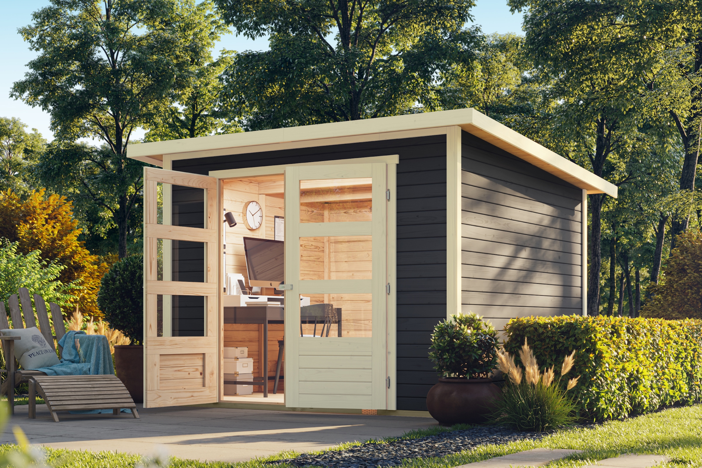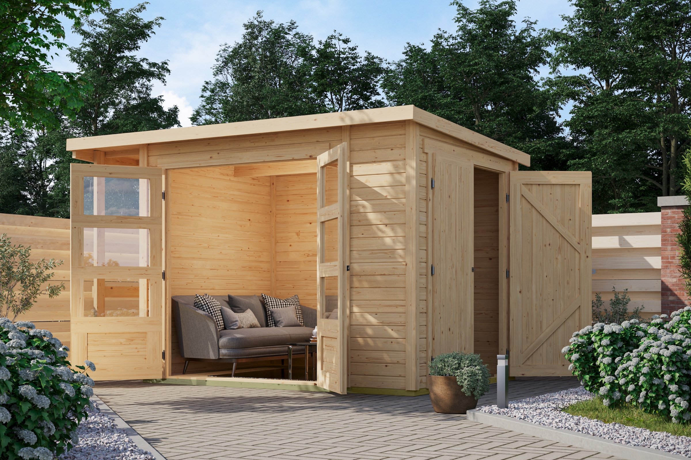 Größere Gartenhäuser lassen sich wie ein Zimmer einrichten. Sie sind mit mehreren Fenstern versehen, die viel Licht hineinlassen, und verfügen oft über ein verlängertes Vordach, unter dem Sie gut vor Regen geschützt im Freien sitzen. Einige Modelle bieten sogar eine Kombination aus geschlossenem Zimmer und offener überdachter Terrasse – so können Sie warme Sommerabende im Freien verbringen und sich bei kälteren Temperaturen nach drinnen zurückziehen. Möchten Sie keinen zweiten Geräteschuppen kaufen, achten Sie auf zweigeteilte Gartenhäuser: Sie weisen einen größeren Innenraum auf, in dem Sie es sich gemütlich machen, und einen kleineren Raum zum Abstellen von Gartengeräten.