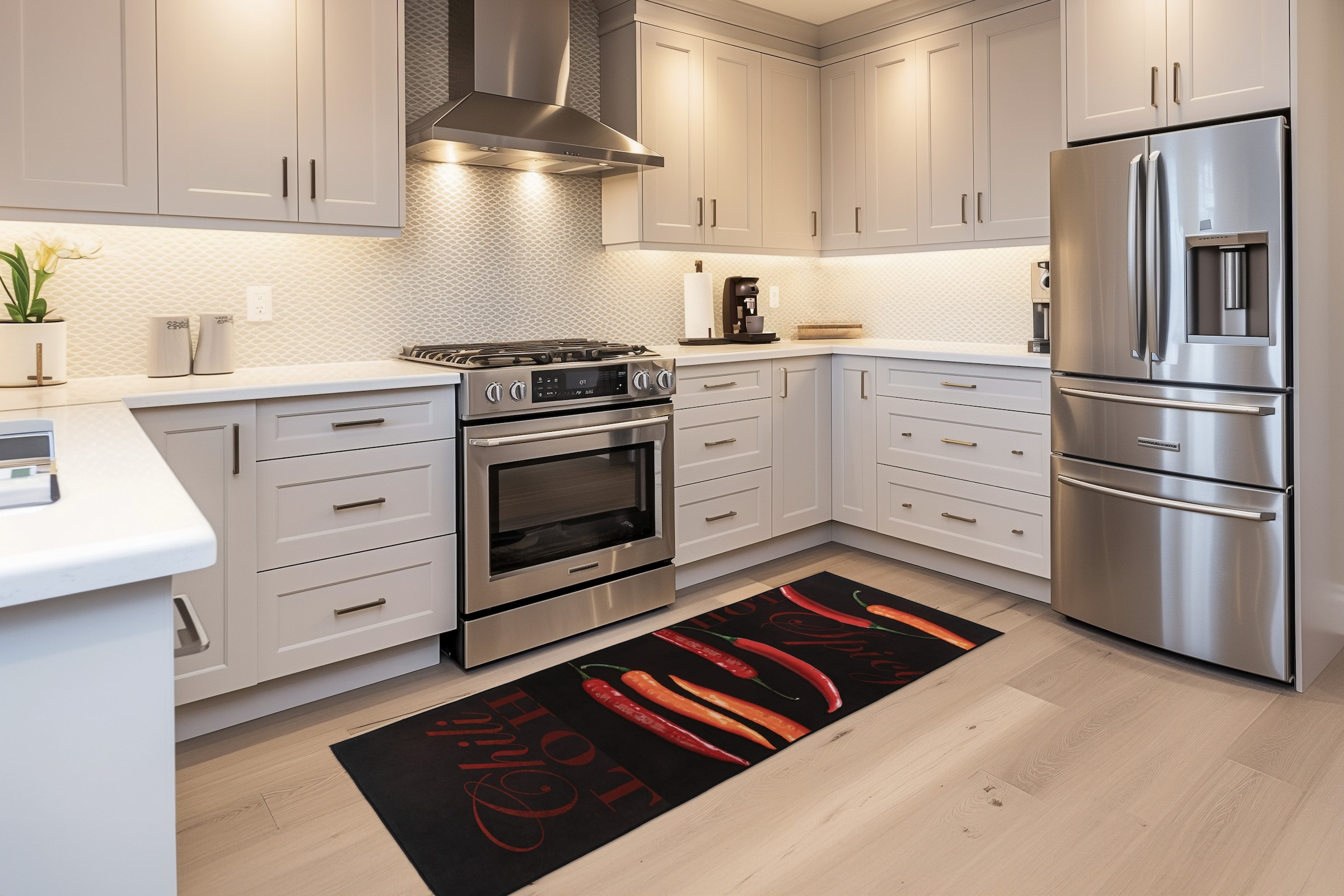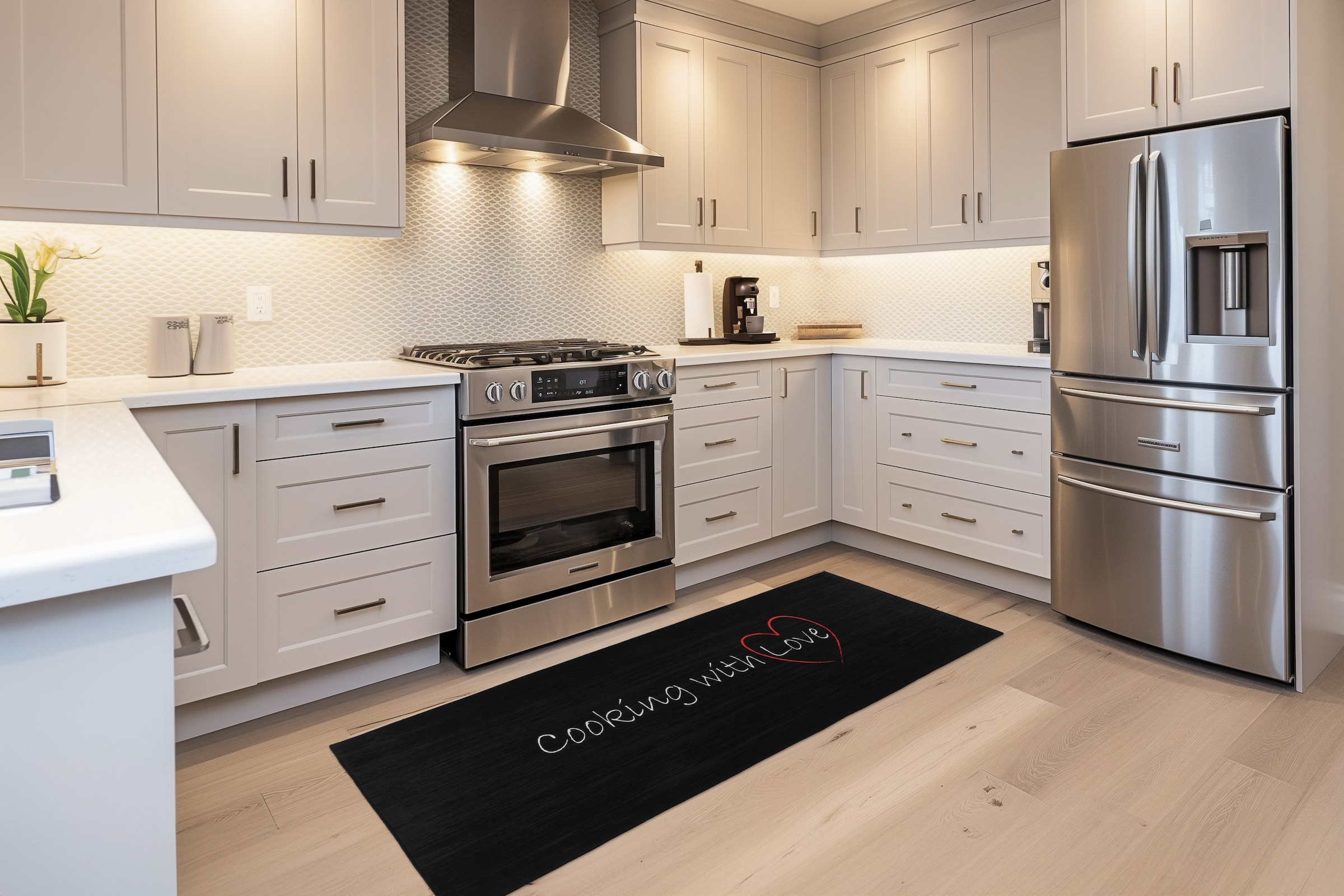 - Strapazierfähige Küchenteppiche mit zeitgemäßen Kaffee-Motiven, die auch für Böden mit Fußbodenheizungen konzipiert sind