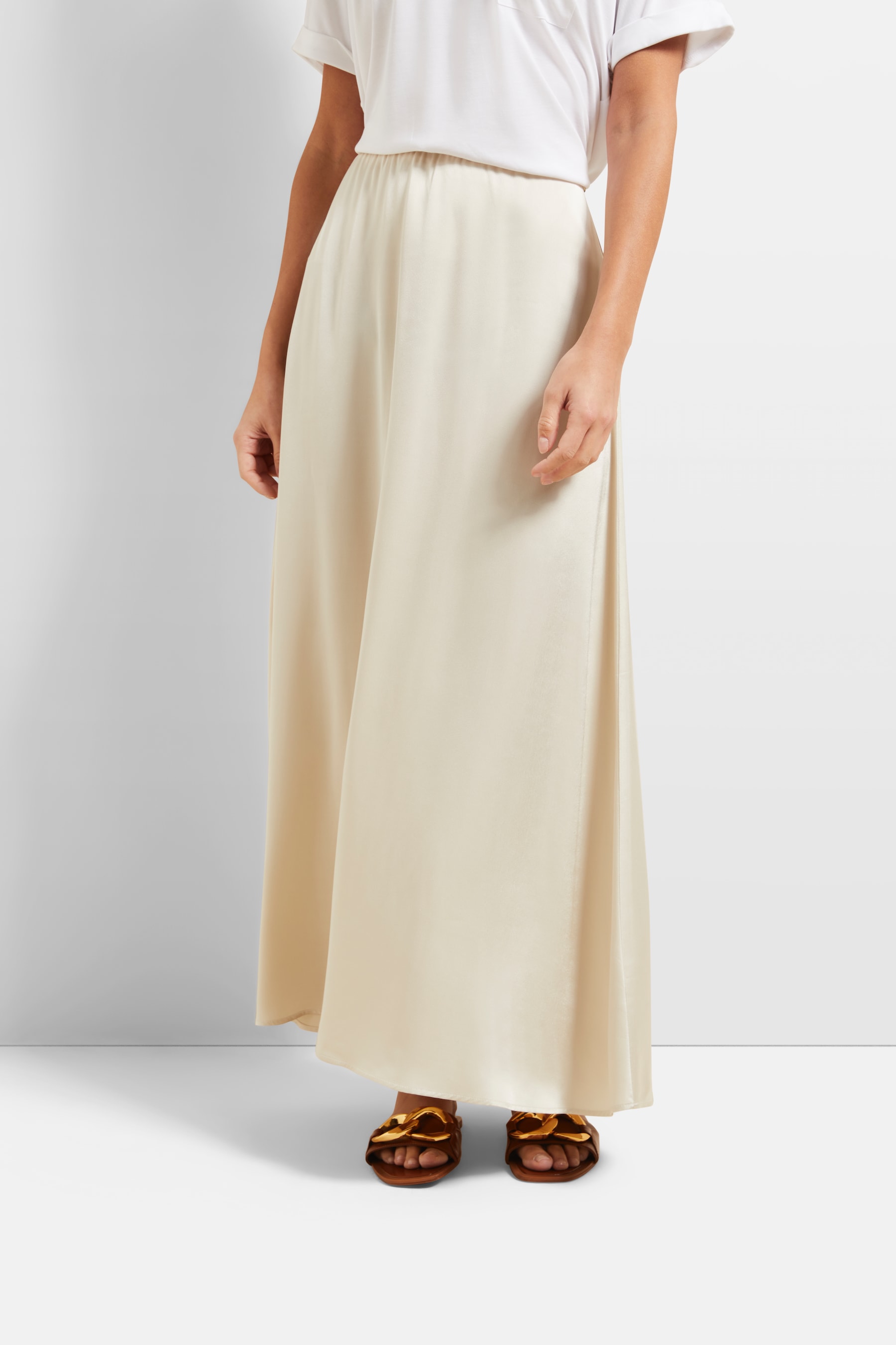 Oben Hingucker, unten Basic: Mit einem schlichten, gerade geschnittenen Jerseyrock in Knielänge kommen auffällige Oberteile besonders gut zur Geltung. Ein Top mit exotischem Muster, mit Glitzer-Applikationen oder starken Sprüchen harmoniert erstklassig damit. Tipp: Stecken Sie das Shirt in den Bund, um Ihre Taille zu betonen.- Kontraste begeistern: Kurze kastige Oberteile, auch als Crop-Tops bekannt, verstehen sich mit einem weiten Maxirock hervorragend. So erzeugen Sie eine stimmige Silhouette und stylen den Look mal elegant, mal sportiv. Ganz in Schwarz, mit einem Top aus seidig glänzendem Material und High-Heel-Riemchensandalen führen Sie das Ensemble abends aus. Sneaker und ein Baumwoll-Oberteil empfehlen sich für einen entspannten Freizeitdress.