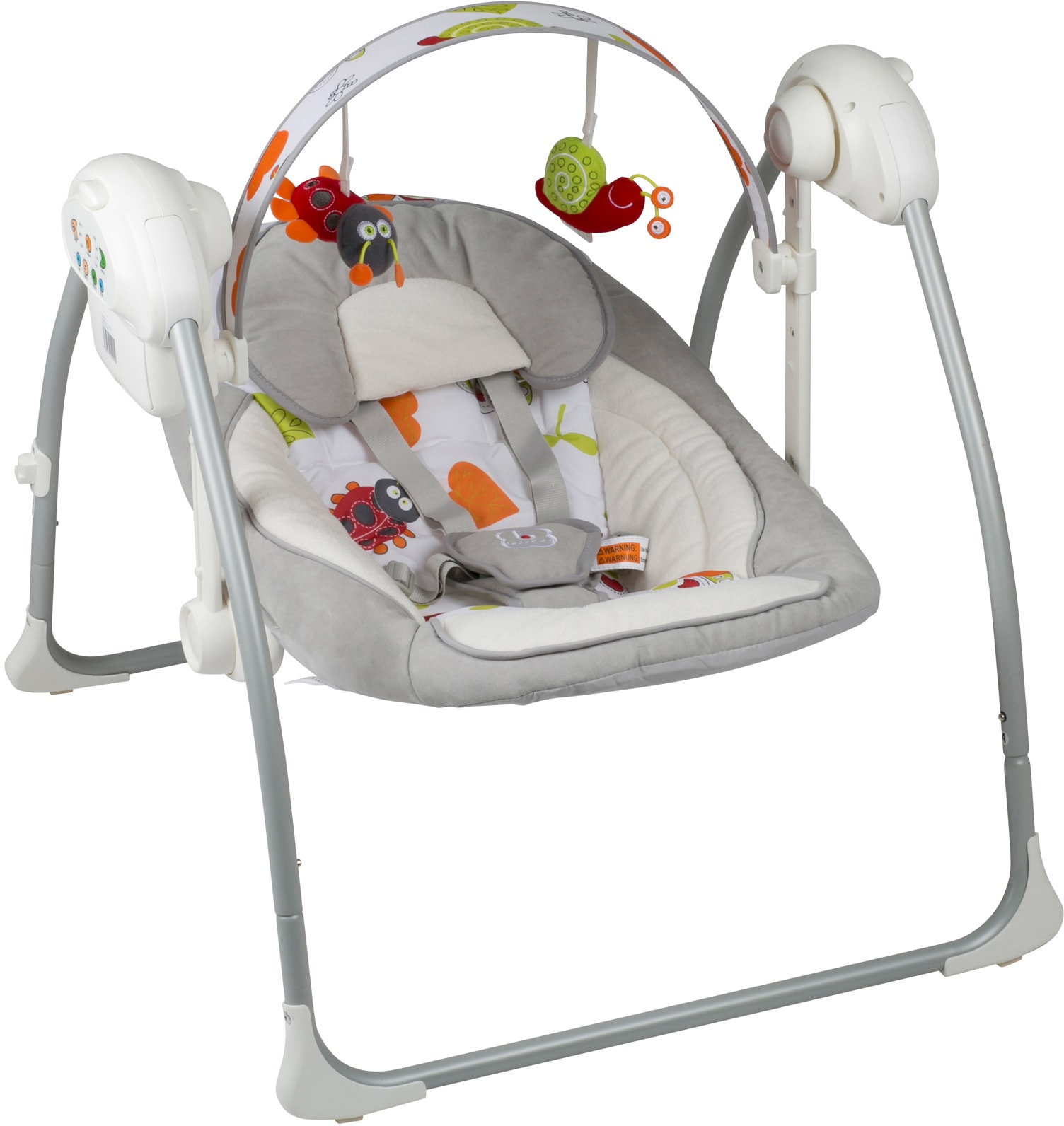 Die elektronische Babywippe »Dandly, grey« von babyGO ist eine unterhaltsame Wippe, in der sich Ihr Baby sicher wohlfühlen wird. Die Schwunggeschwindigkeit kann in 3 Positionen eingestellt und so auf den individuellen Bedarf Ihres Kindes eingegangen werden. Der praktische Timer kann auf 10, 20 oder 30 Minuten eingestellt werden. Zur akustischen Untermalung der Babywippe gibt das elektronische Modul entspannende Melodien von sich, deren Lautstärke reguliert werden kann. Für mehr Sicherheit ist die Babywippe mit einem 5-Punk-Sicherheitsgurt ausgestattet. Der Spielbogen mit den beiden Figuren rundet das niedliche Design ab.