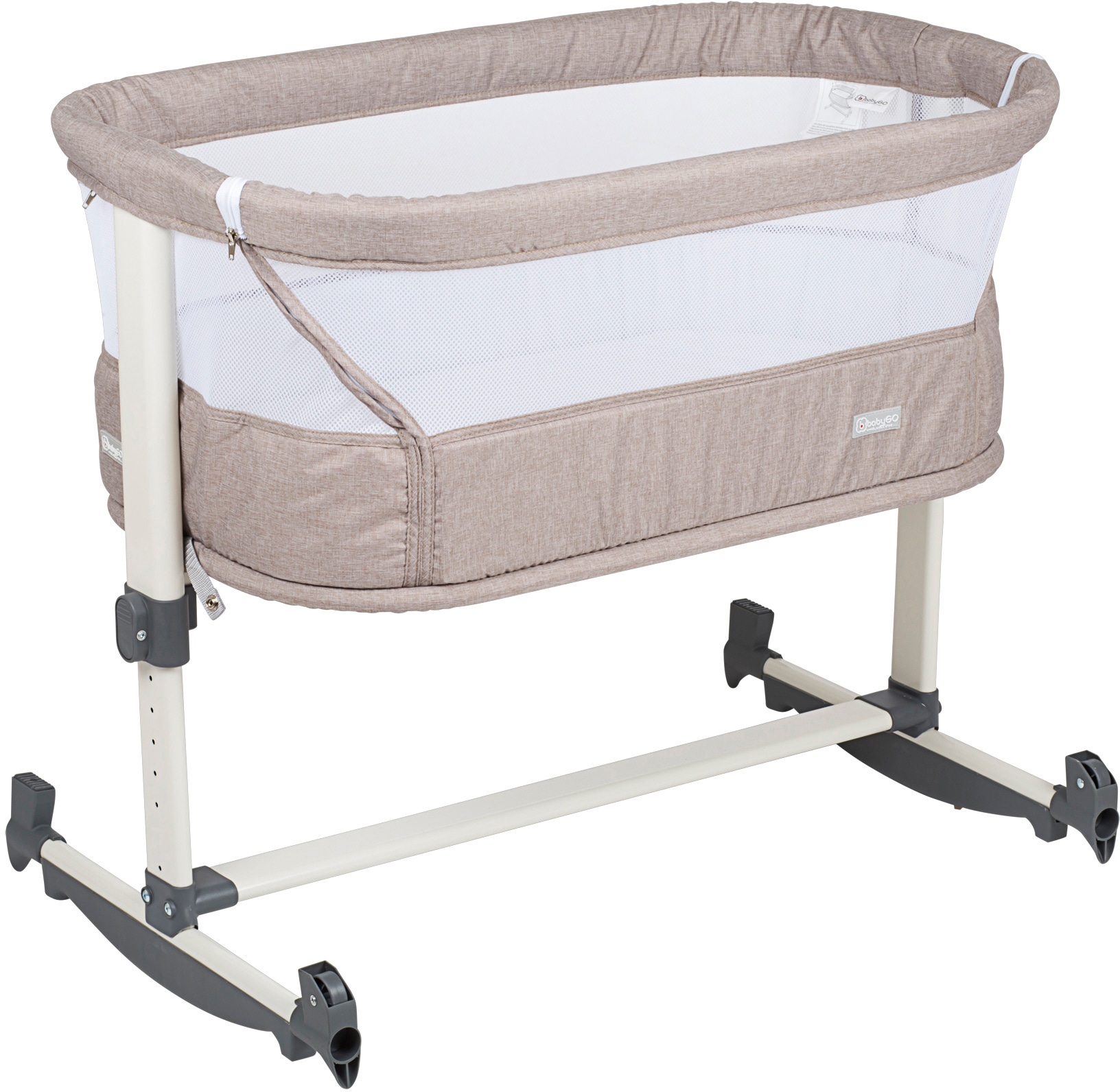 Das babyGO Beistellbett »Vivaldi, beige« bietet Eltern und Kind besonders entspanntes Schlafen. Seite an Seite mit dem Elternbett und dank 6-fach höhenverstellbarer Möglichkeit liegen Eltern und Kind beieinander auf einer Ebene. Durch die mittels Reißverschlüssen leicht zu öffnende Seite ist das Stillen vom Elternbett aus wunderbar einfach und bequem. Auch zu einem Schaukelbett lässt es sich völlig unkompliziert umfunktionieren indem man die Enden der Stützfüße herumdreht. Sämtliche Bezüge sind einfach abnehmbar und waschbar, das Metallgestell ist mit jedem herkömmlichen Reiniger zu reinigen. Da die Stützfüße des babyGO Beistellbetts auch Rollen besitzen, lässt es sich in jede passende Position schieben. Die rundum mit Netzstoff versehenen Seiten sorgen für eine maximale Luftzirkulation.