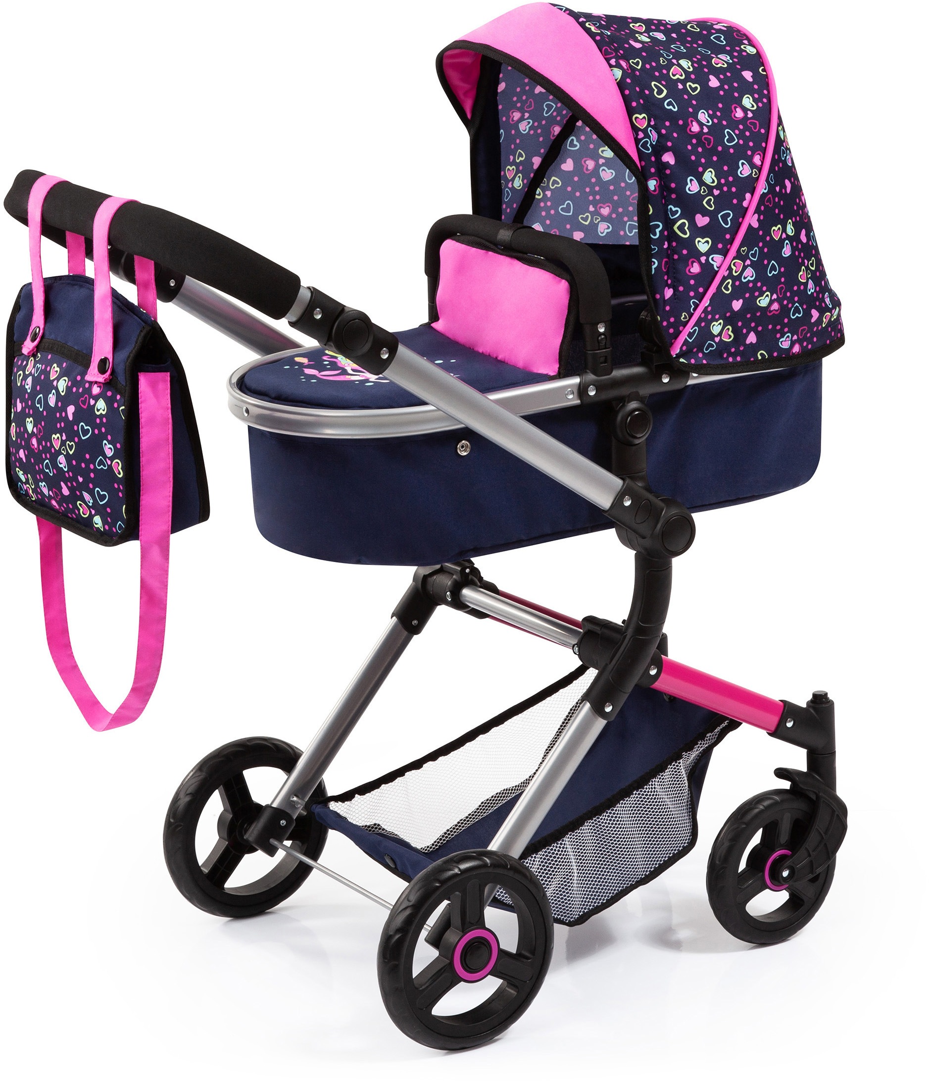 Bayer Kombi-Puppenwagen »Vario, Blau/Pink/Herzchen« inkl. Wickeltasche