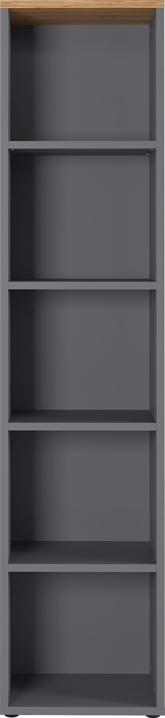 Aktenregal mit vier verstellbaren Einlegeböden (jeweils mit bis zu 30 kg belastbar); Ober- und Unterboden mit bis zu 30 kg belastbar; vier schwarze Möbelgleiter; Melaminharzbeschichtung, ABS-Kanten, Made in Germany.