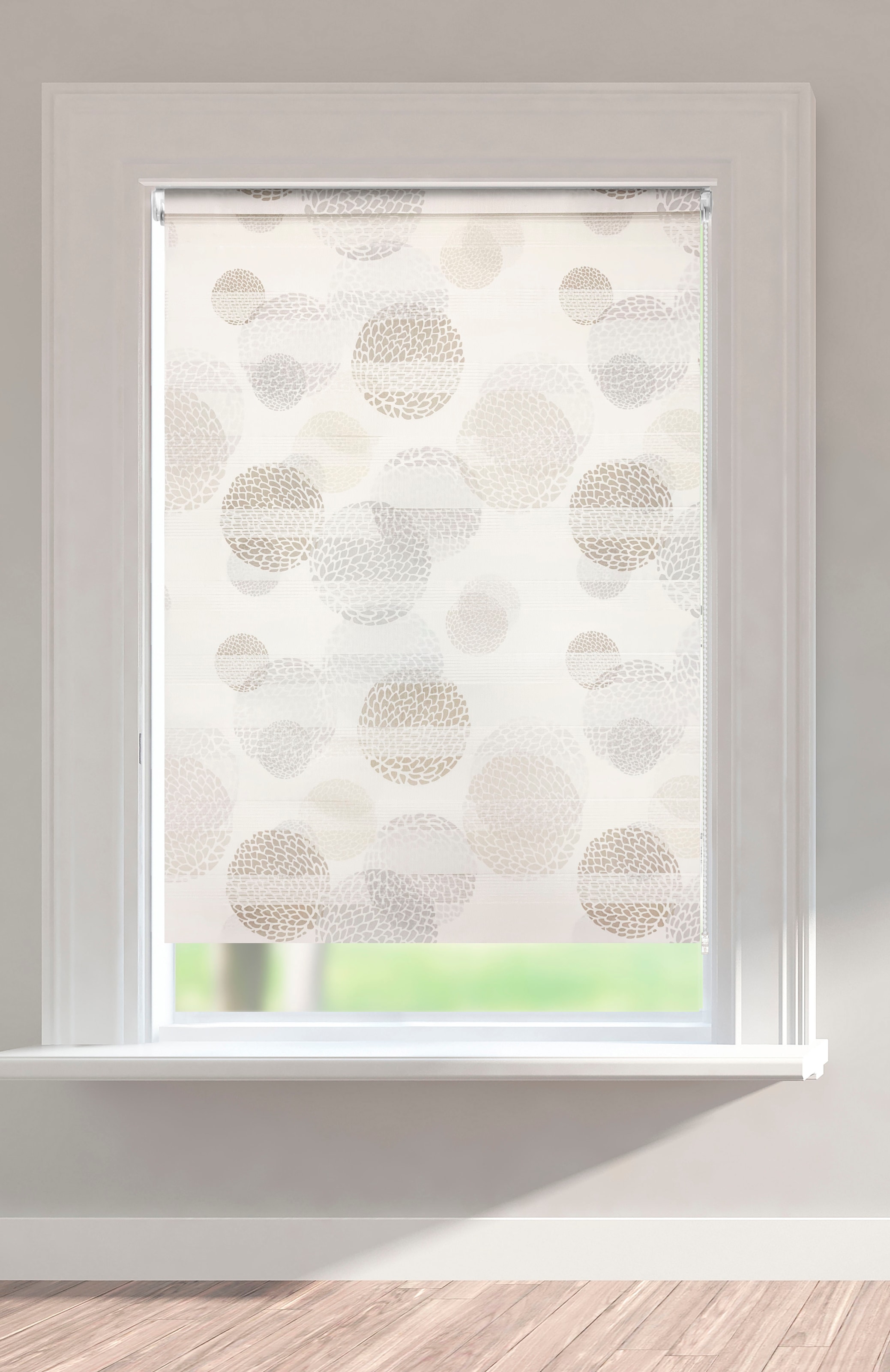 my home Doppelrollo »Belem« Lichtschutz Sichtschutz | Verdunkelung ohne Bohren freihängend halbtransparent, im Fixmaß, Kreise, bedruckt, Klemmträger