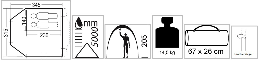 Dieses Zelt zeichnet sich durch durchdachte Details und hochwertige Verarbeitung aus.So verhindert der Extra-PE-Boden für den Wohnraum Schmutz und Kondensation.Die perfekte Belüftung wird durch 4 Türen gewährleistet, von denen 2 mit einer zusätzlichen Moskitonetztür dahinter ausgestattet sind, so dass man auch heiße Sommertage vor Plagegeistern, Mücken, Wespen geschützt im Zelt verbringen kann. Leichter Auf- und Abbau durch Clip-On Stangensystem.Jetzt neu mit bruchsicherem DURA-WRAP-Gestänge!