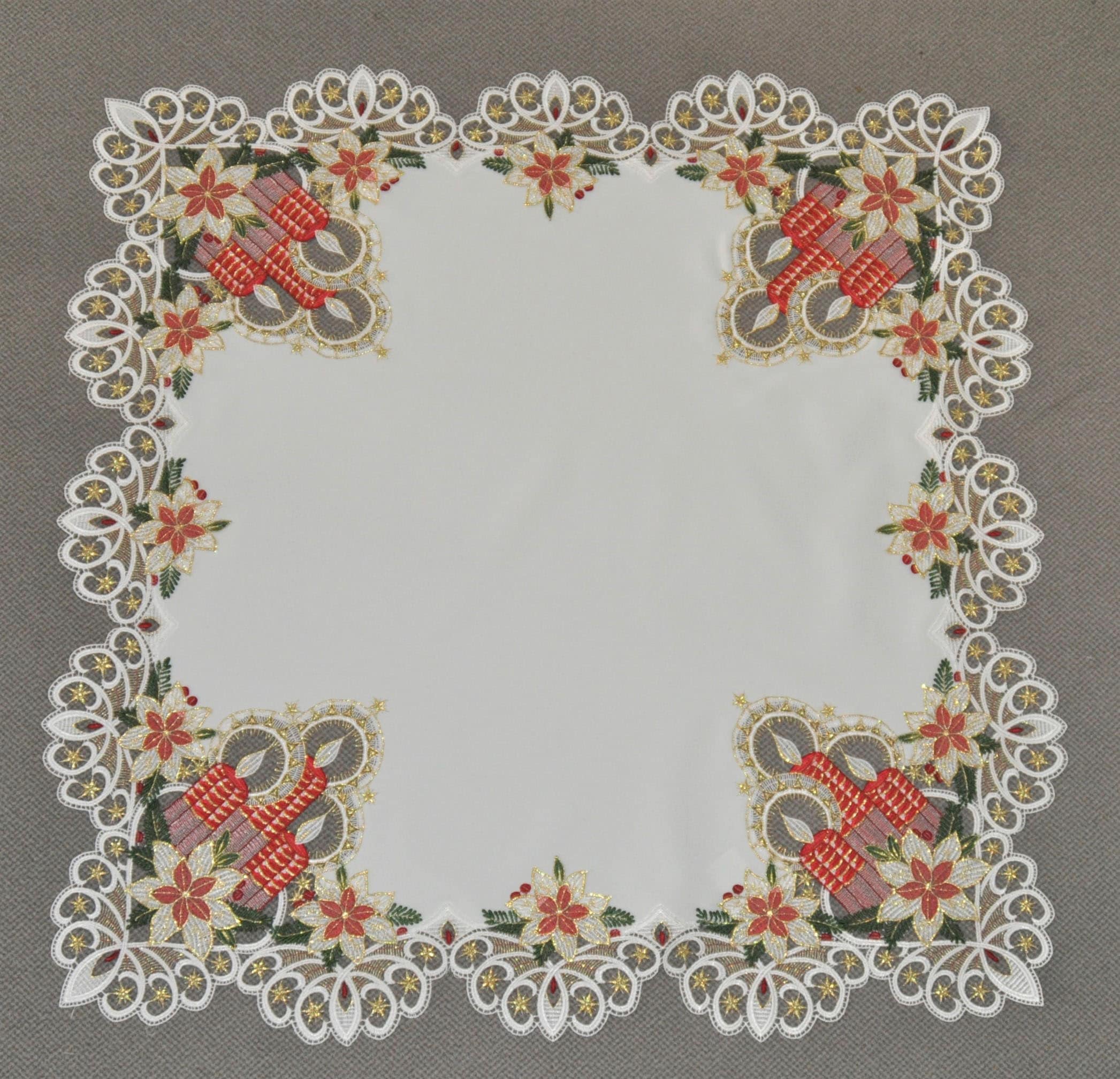 Traumhafte, weihnachtliche Mitteldecke, bestickt mit farbigen Weihnachtskerzen als Eckmotive aus echter Plauener Spitze. Satingewebe, leicht glänzend, pflegeleicht. Waschbar bei 30 Grad Schonwäsche. Diese in Deutschland hergestellte Weihnachtsdecker wird auch Ihren Tisch zur Weihnachtszeit verzaubern. Edle Christrosen in der Bordüre runden diese Mitteldecke elegant ab.