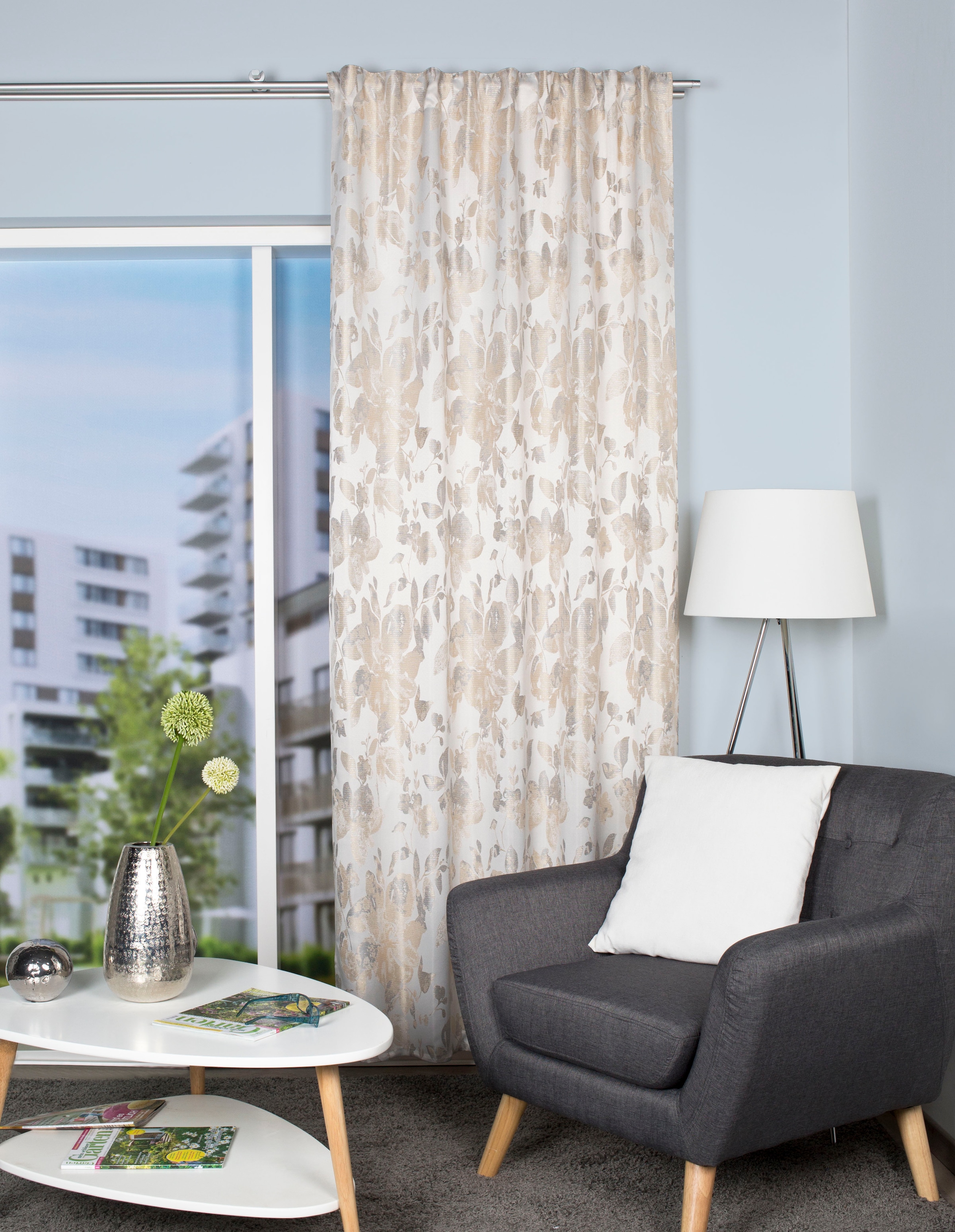 Klassischer Kombibandschal aus schwerem Dekostoff mit jacquardgemustertem Blumenmotiv mit schönen Glanzgarnen verarbeitet. Oben mit Multifunktionsband, welches Ihnen die Aufhängung an Ihre Gardinenstange und Gardinenschiene ermöglicht. Seiten und Abschluss gesäumt. Aus 100% Polyester