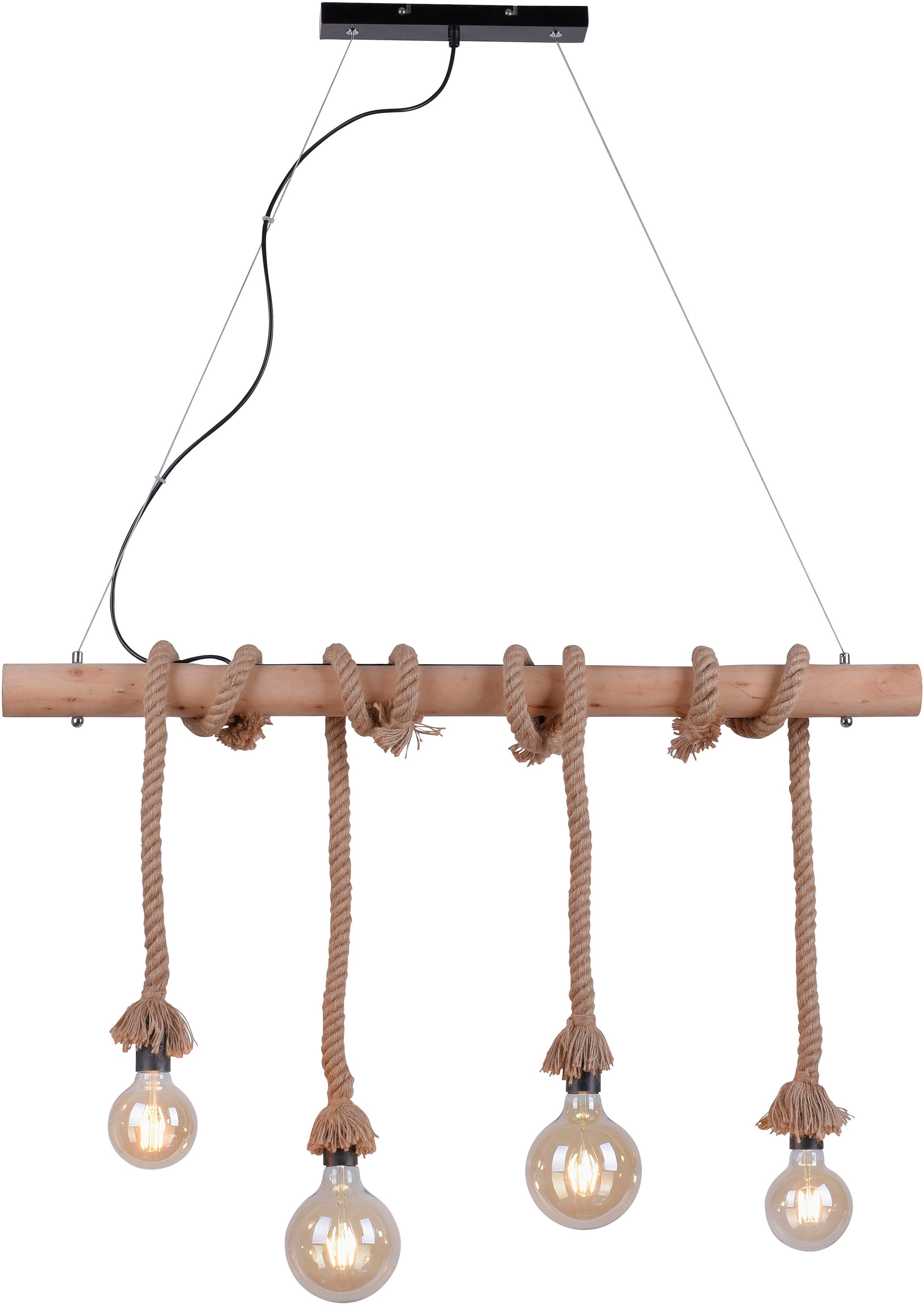 Die 4-flammige Pendelleuchte ROPE besticht mit einem rustikalen, maritimen Design. Das Pendel wird ohne ein Leuchtmittel geliefert. Sie haben die Möglichkeit die Pendellampe mit vier E27-Leuchtmitteln bis jeweils maximal 15,0 Watt zu bestücken. Wählen Sie selbst welches Leuchtmittel bei Ihnen Verwendung findet. Das rustikale Aussehen wird durch die Verwendung eines Filament-Leuchtmittels, gern auch zwei unterschiedliche Leuchtmittel, ideal zur Geltung gebracht und lässt Ihre Leuchte zum Hingucker werden. Die einzelnen Taue können in der Länge nach Belieben variiert werden in dem man Sie einfach oder mehrfach um den Holzbalken dreht. Die hübsche Lampe fügt sich in vielen Wohnstile perfekt ein und erfüllt einen absoluten dekorativen Effekt.