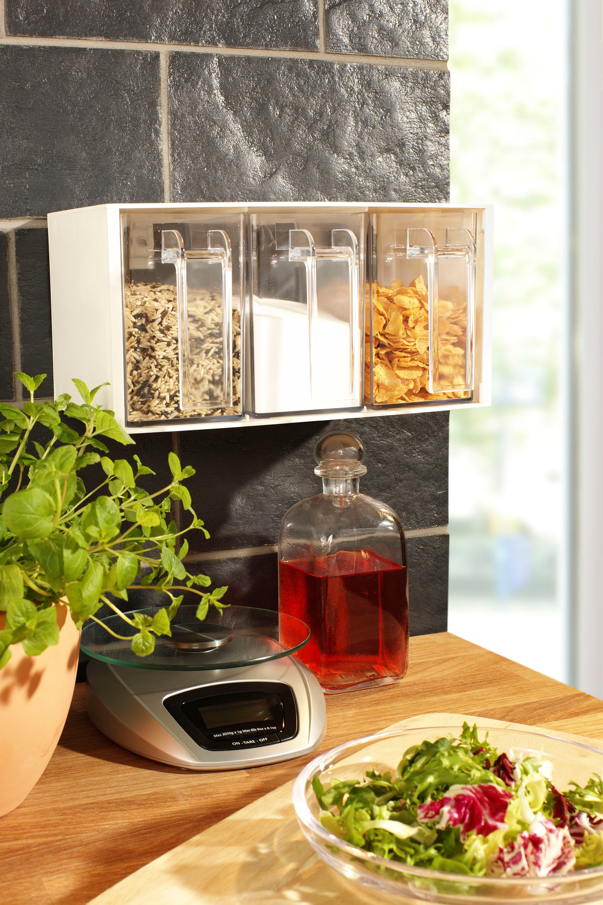 Mit den praktischen Schüttenset aus lebensmittelechtem Kunststoff sind Koch- und Backzutaten stets griffbereit und ordentlich aufbewahrt. Jedes Gefäß hat ein Fassungsvermögen von 1 Liter. Das Set besteht aus einem Gehäuse mit jeweils 3 Schütten. Die Gehäuse können problemlos aufeinandergestapelt werden.