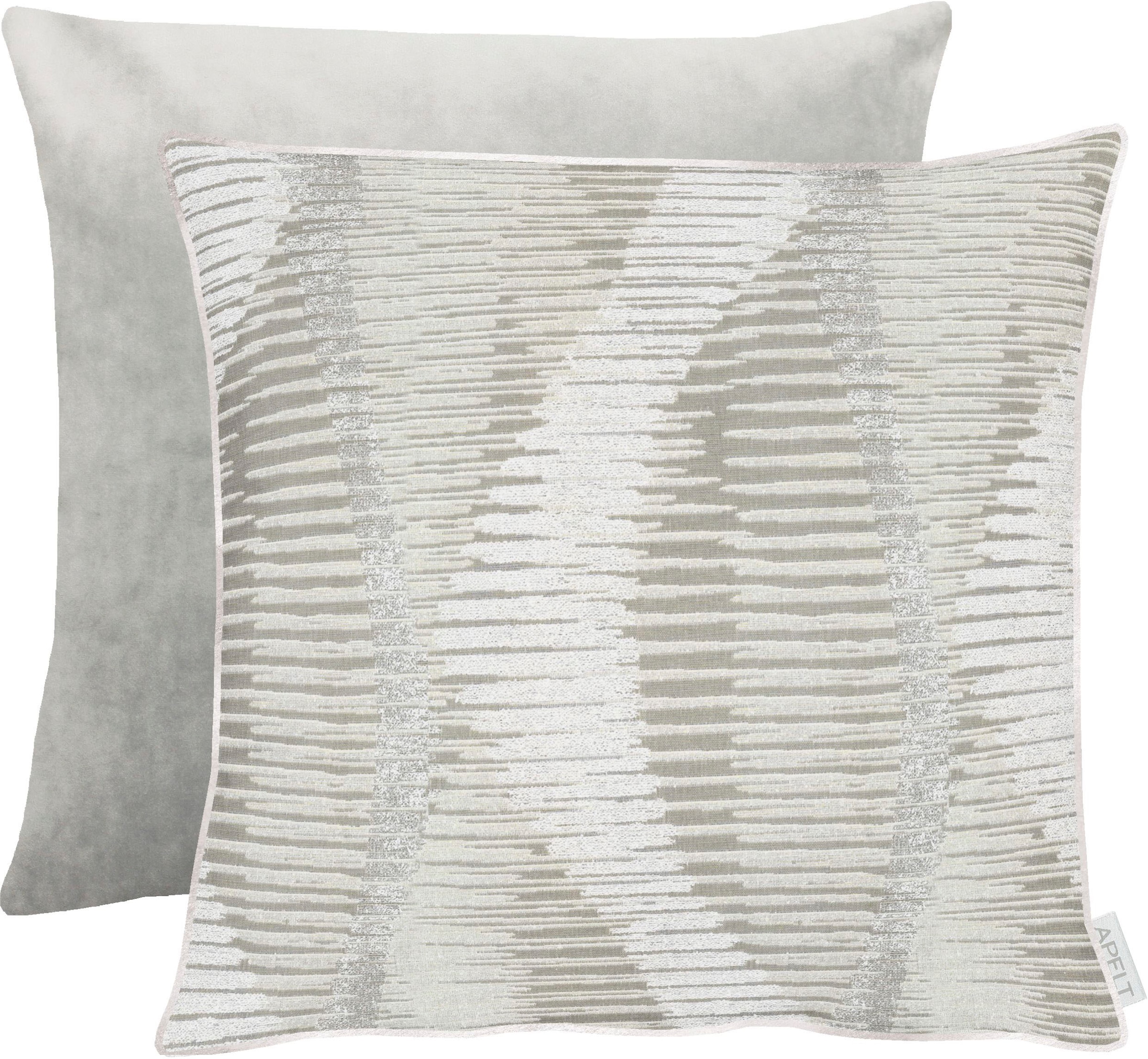 Hochwertiger Jacquardstoff aus dem Hause Apelt- Ein besonderes Jacquardgewebe mit modern aufgefassten Flächen und Strukturen und interessanten Garnmischungen. In vielen schönen Wohnfarben, geschaffen für zeitgemäßes Einrichten mit Textil. Die eleganten Kissenhüllen haben einen praktischen Reißverschluss und eine Samtabseite. Das hochwertige Material besteht aus 45% Polyester, 40% Baumwolle und 15% Viskose. Einsatz von NEWLIFE™ einem neuen Garn aus recyceltem Plastik in der textilen Produktion bei APELT. Waschbar mit 30°C im Schonwaschgang, feucht aufhängen, auf 2 Punkt bügeln.Schadstoffgeprüft nach STANDARD 100 by OEKO-TEX® und made in Germany.
