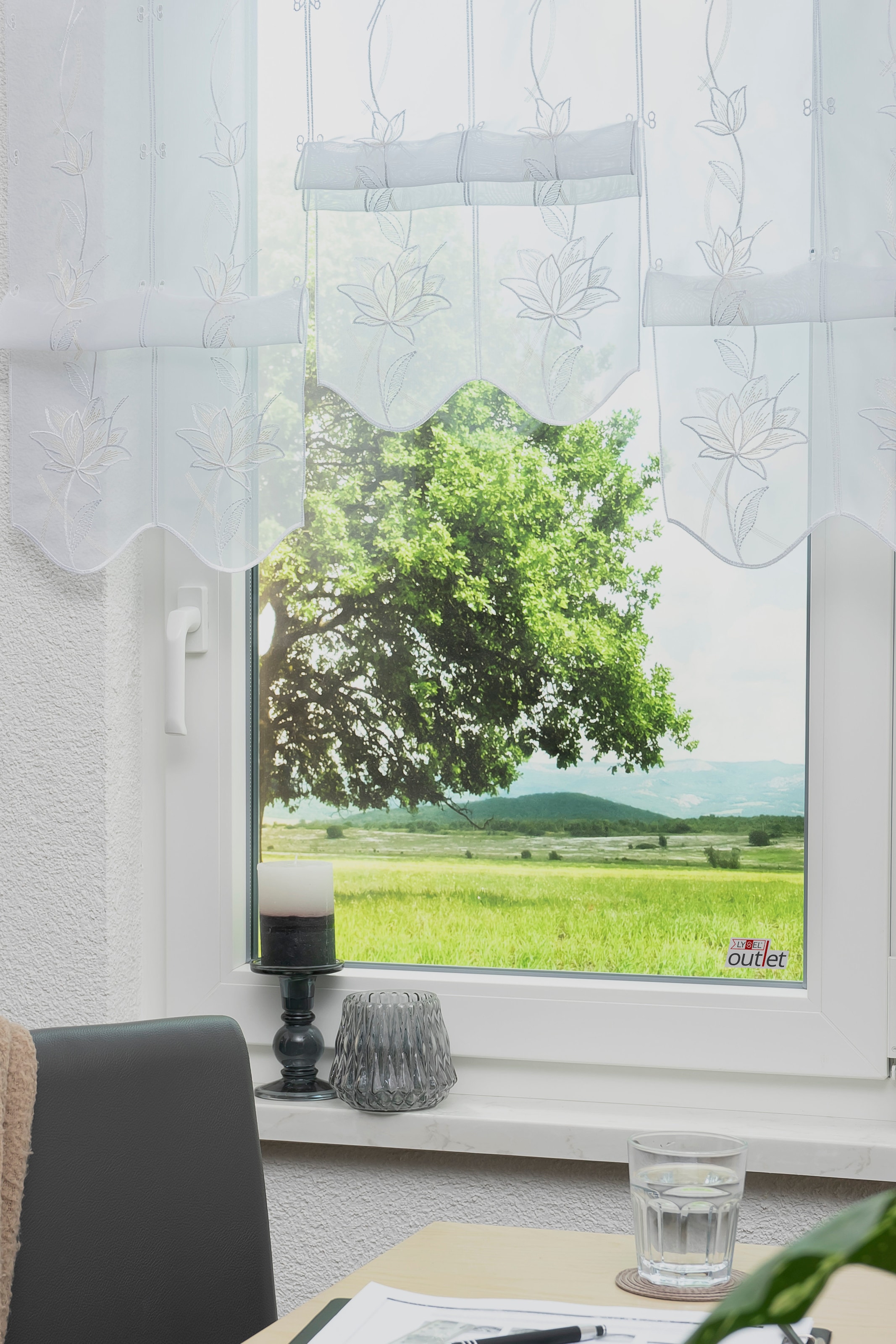 Für neue Ausblicke sorgt diese reichaltig bestickte Scheibengardine »Kiara« aus dem Hause Stickereien und Textilien Plauen. Echte Plauener Stickerei gesickt auf einem Transparentem Voile sorgt für ein wunderschönes Wohnambiente. Auch ideal für die Küche geeignet. Das pflegeleichte Material ist in der Maschine waschbar. Mit dem leichten Glanz des Polyestergarnes wird ein stilvolles Ambiente an Ihrem Fenster geschaffen.