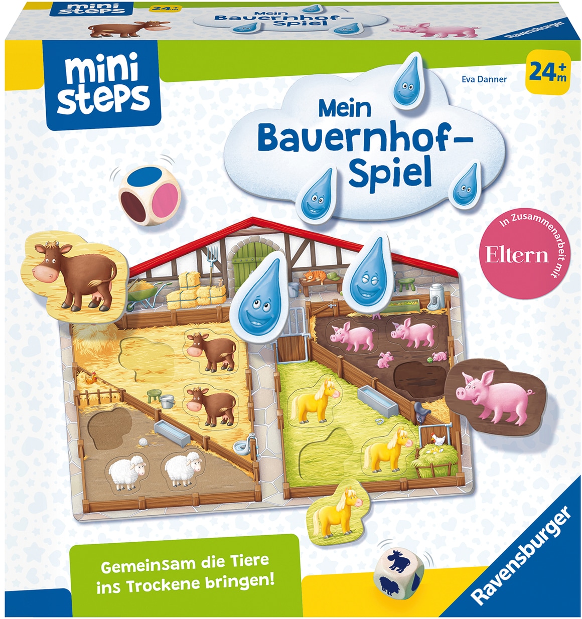 Das kooperative Würfelspiel »ministeps® Unser Bauernhof-Spiel« von Ravensburger ist perfekt für Kleinkinder und sorgt für jede Menge Spielspaß. Oje, über dem Bauernhof zieht eine große, dicke Regenwolke auf, und die Kühe, Pferde, Schafe und Schweinchen befinden sich noch alle draußen auf der Weide! Jetzt aber nichts wie los! Alle Kinder versuchen gemeinsam im Spiel, die Tiere in den trockenen Stall zu bringen, bevor die Regenwolke voller Tropfen ist. Der große Holzwürfel zeigt an, welches Tier in den Stall gepuzzelt werden darf oder ob ein weiterer Regentropfen die Wolke füllt. Ein spannender Wettlauf beginnt, bei dem alle Spieler gemeinsam gegen die Regenwolke gewinnen oder verlieren und so ein intensives "Wir-Gefühl" erleben. Gleichzeitig fördert das Spiel ein erstes Regelverständnis, die Feinmotorik und die Sprachentwicklung der Kleinen. Für ältere Kinder gibt es zudem eine fortgeschrittene Variante mit einem großen Farbwürfel aus Holz. Das »ministeps® Unser Bauernhof-Spiel« von Ravensburger ist ein echtes Multitalent unter den didaktischen Spielen, denn es ist sowohl ein klassisches Puzzle als auch ein kooperatives Würfelspiel mit zwei unterschiedlichen Spielvarianten für kleine Entdecker ab 24 Monaten.
