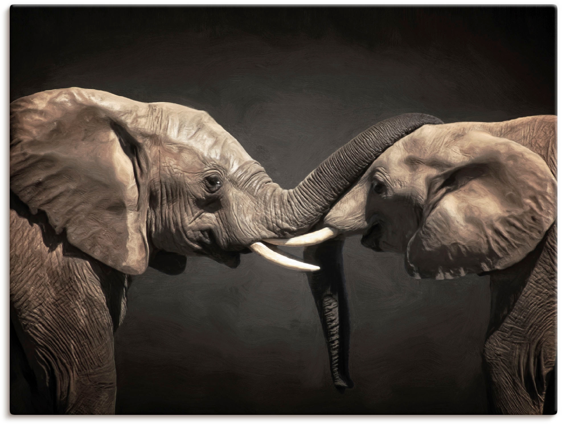 Mit viel Liebe für kunstvolles Wohnen verleiht unser Leinwandbild mit dem Motiv "Zwei Elefanten" von Angela Dölling Deinem Zuhause Charakter. Es begeistert durch hochauflösende Druckqualität und hochwertige Materialien – Made in Germany.