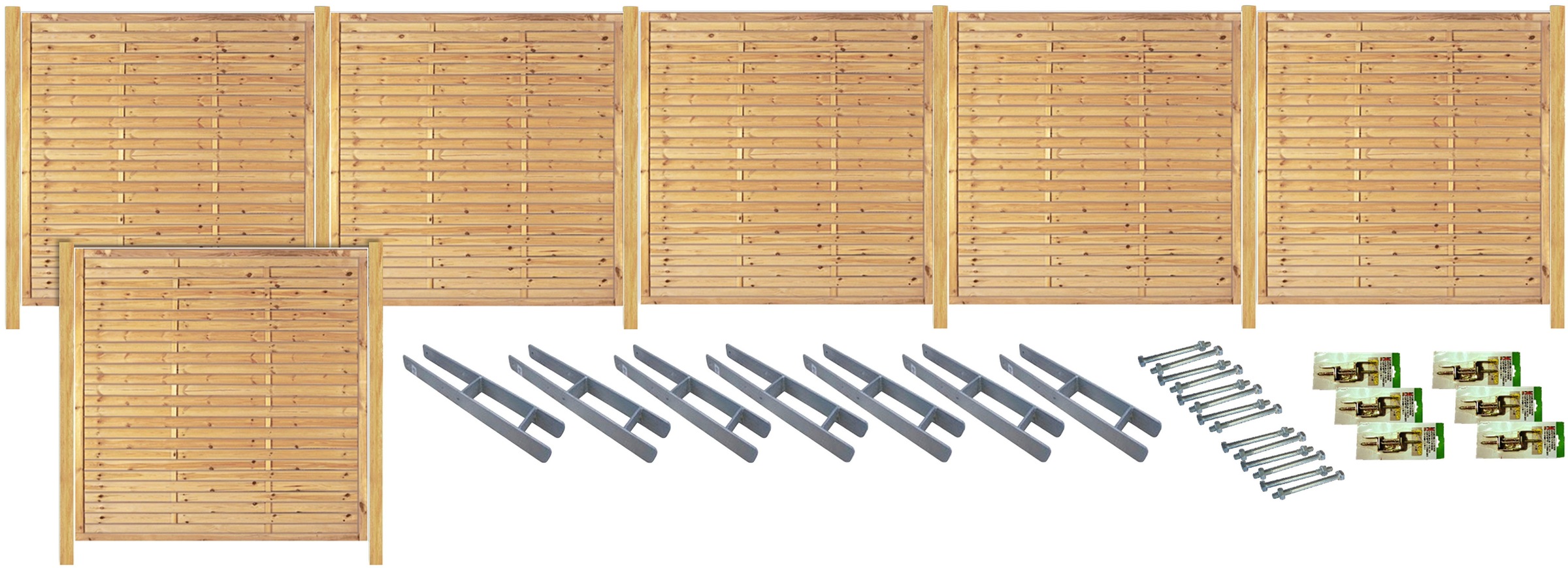 Lieferumfang | 2 Elemente 180x180 cm; 1 Element 90x180 cm; 1 Eckelement 90x180/90 cm; 4 Pfosten 9x9x190 cm; 1 Pfosten 9x9x100 cm; 5 H-Pfostenträger, 4 Pakete L-Beschläge mit Schrauben; 5 Pakete Durchgangsschrauben. |