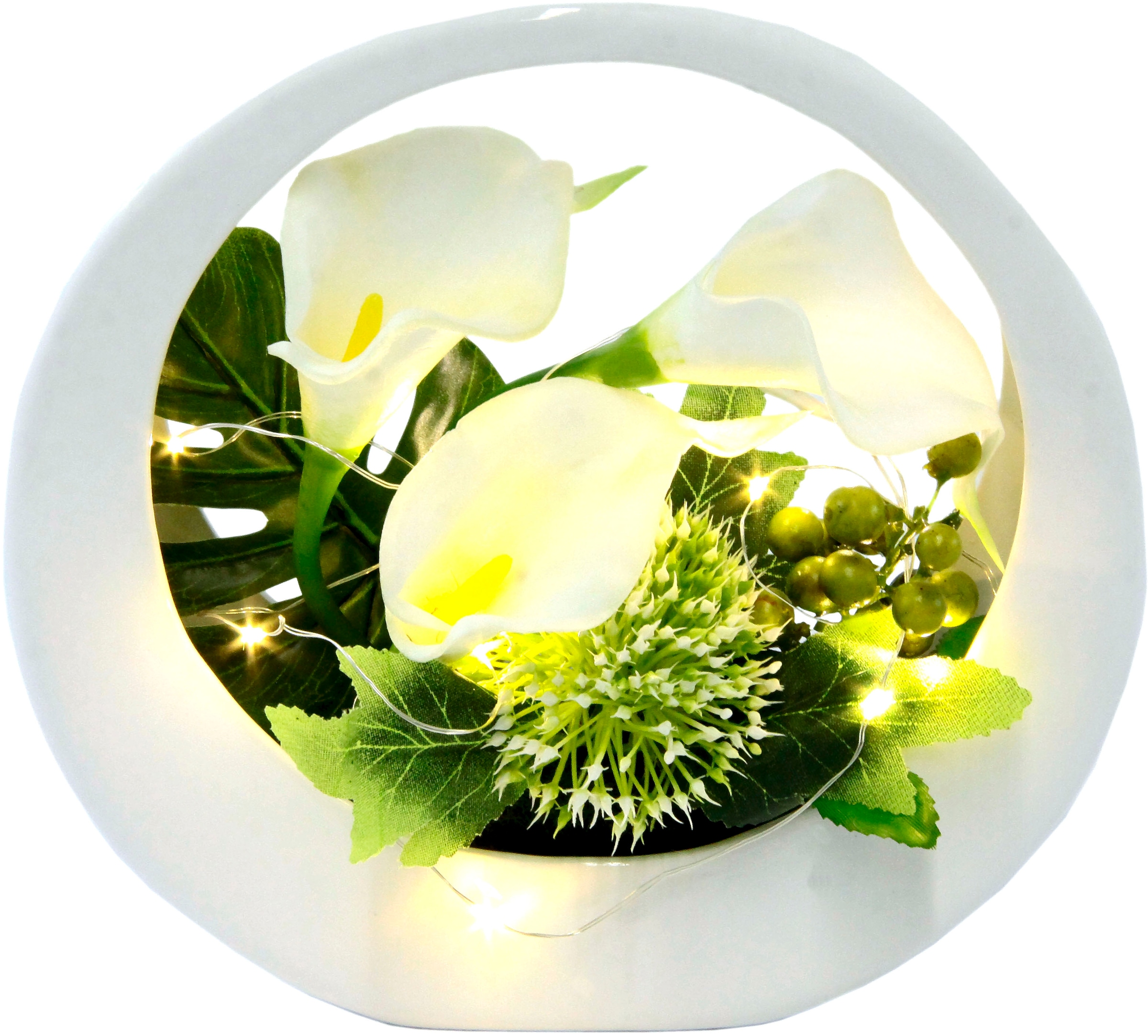 Ein attraktives Highlight für das Zuhause ist die dekorative Calla in runder Keramikvase. Die Dekoration im modernen Stil ist schön anzusehen und wertet das Ambiente in Wohnräumen auf. Es handelt sich um eine Kunstpflanze, die dem Original täuschend echt nachempfunden ist. Die Kunststoffpflanze befindet sich in einer runden Keramikvase und kommt hier besonders gut zur Geltung. Dazu ist das Arrangement mit einer LED-Beleuchtung (10 Lämpchen) ausgestattet. Im Handumdrehen sorgt die Kunstpflanze für eine stimmungsvolle Beleuchtung. Sehr schön wirkt sie auf dem Tisch oder der Fensterbank. Für mehr Gemütlichkeit: die dekorative Calla in Keramikvase.