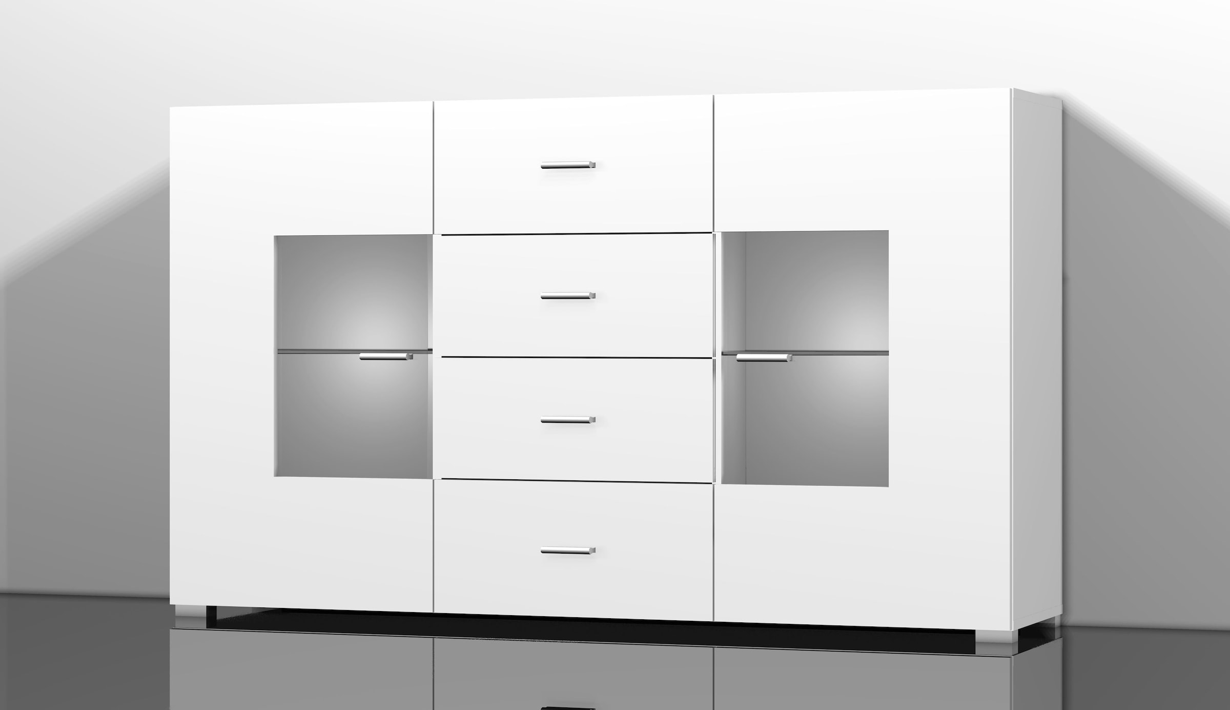 Wissenswertes | Attraktives Anbauprogramm mit einer pflegeleichten Kunststoff-Oberfläche in 2 schönen Farben. Korpus walnussfarben, Front schwarz glänzend oder Korpus weiß, Front weiß glänzend. Hinter den Türen mit Glaseinsatz je 1 Glasboden. In der Mitte 4 Schubkästen (Innenmaße B/T/H: je 45/27/16 cm). Schubkästen auf Metallschienen. Gesamtmaße (B/T/H): 150/37/89 cm. Alles ca.-Maße. Selbstmontage mit Aufbauanleitung. Beleuchtung bitte extra bestellen. |