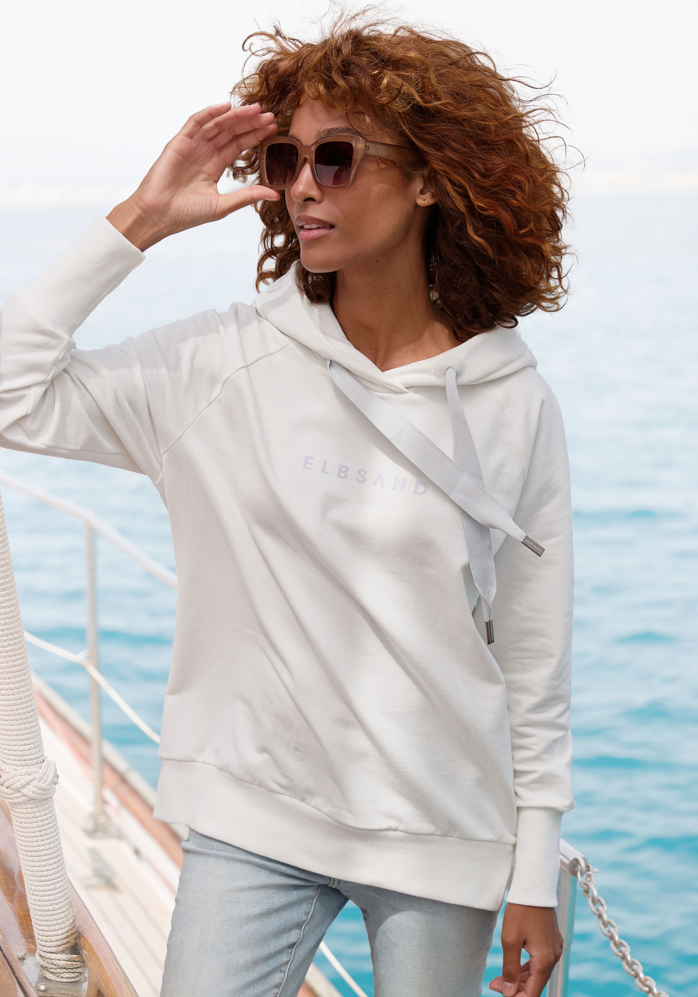 Kapuzensweatshirt "Svana" von ELBSAND mit Logoprints vorn und hinten. Gerader Saum mit Seitenschlitzen. Länge ca. 72 cm. Aus 95% Baumwolle, 5% Elasthan.