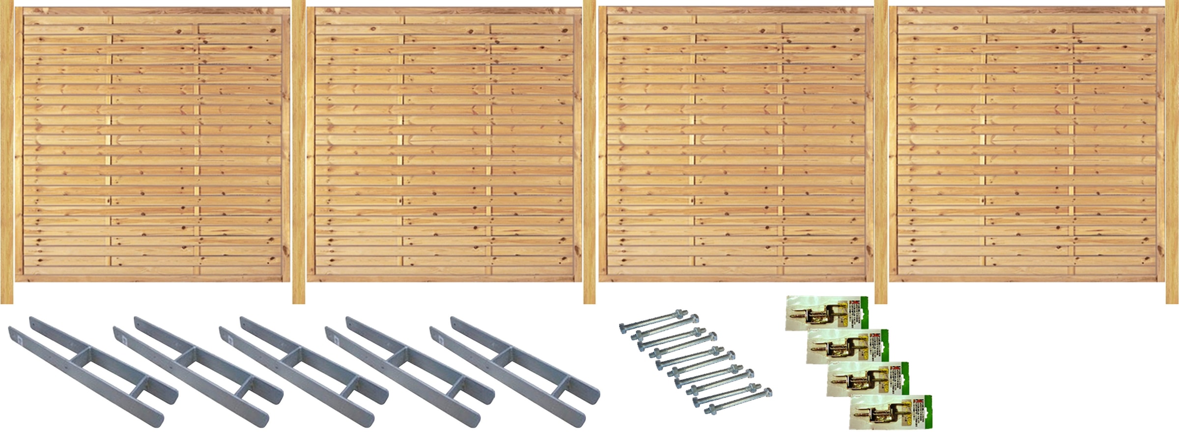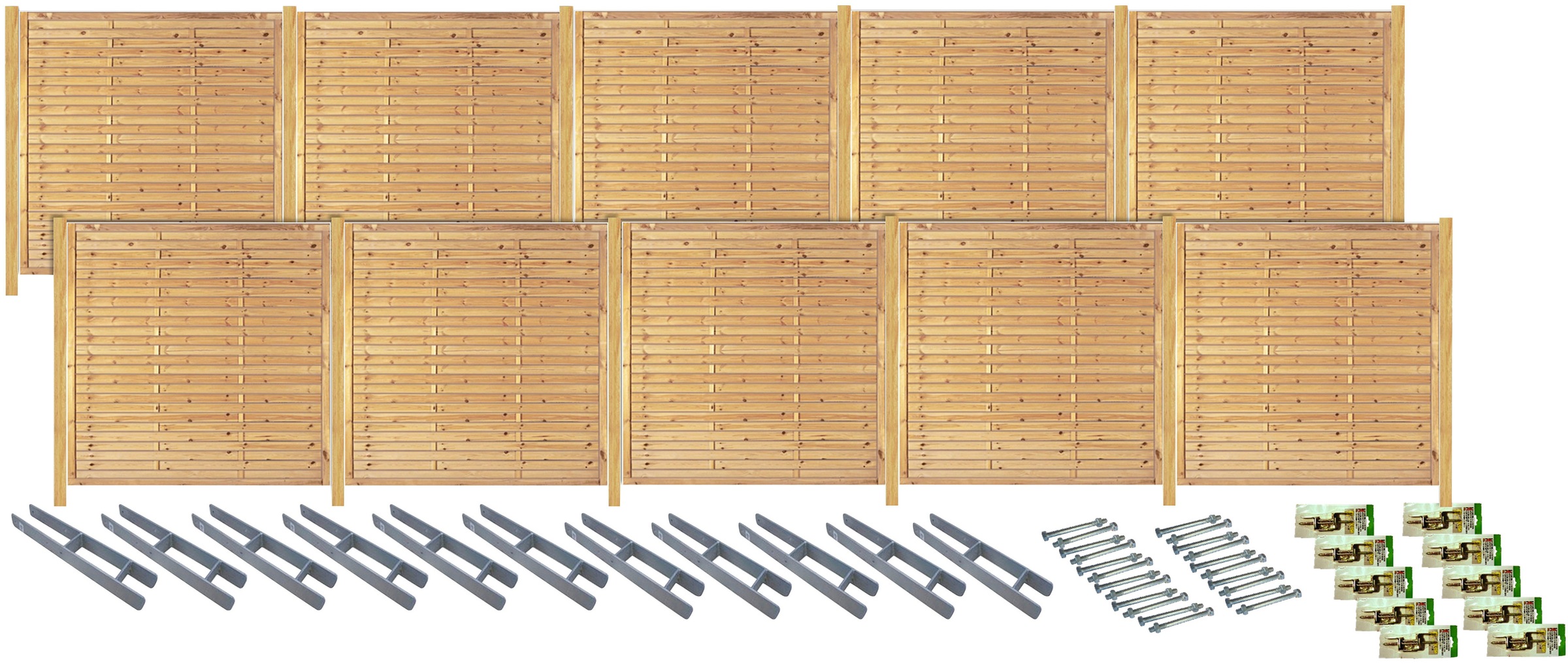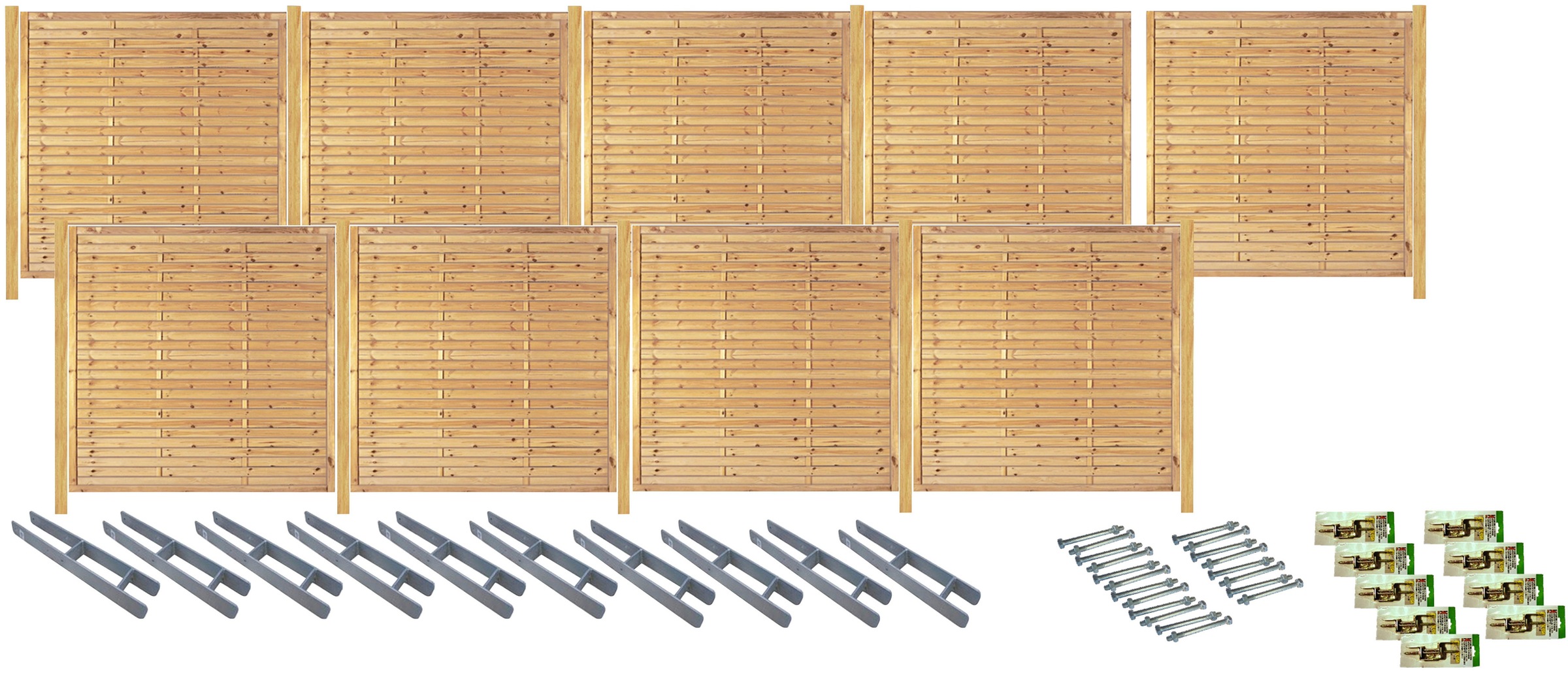 Lieferumfang | 6 Lamellenzäune 180 x 180 cm;7 Pfosten 9 x 9 x 210 cm;7 H-Pfostenträger;7 Pakete Durchgangsschrauben;6 Pakete Winkelbeschläge |