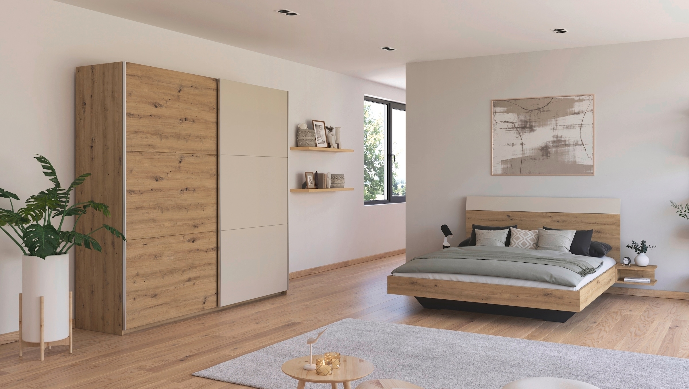 - Set bestehend aus: Bett, 2er Set Nachttische und Drehtürenschrank