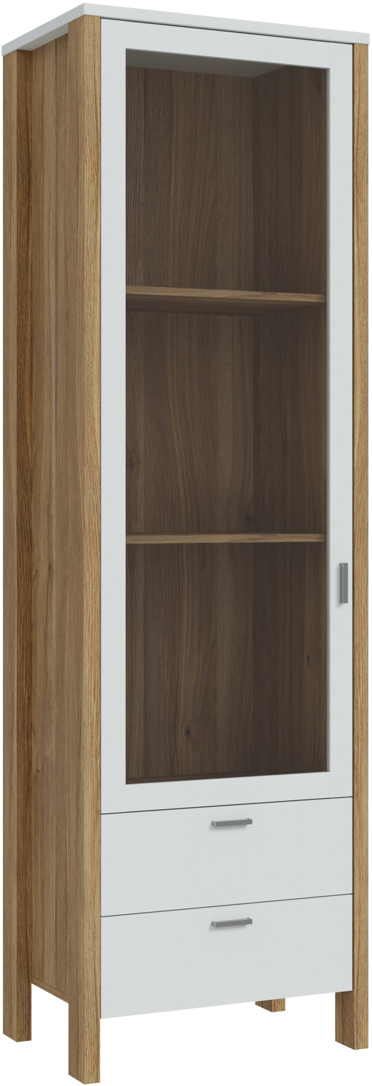 - Glastüre und Metallgriffe in Grau runden die Optik stilvoll ab