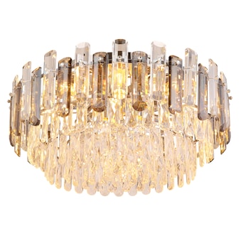 Die Deckenleuchte ORGINA kombiniert funkelnde Kristallbehänge mit rauchfarbenen Glasstäben für eine luxuriöse Beleuchtung. Geeignet für E14 Leuchtmittel (exklusive).