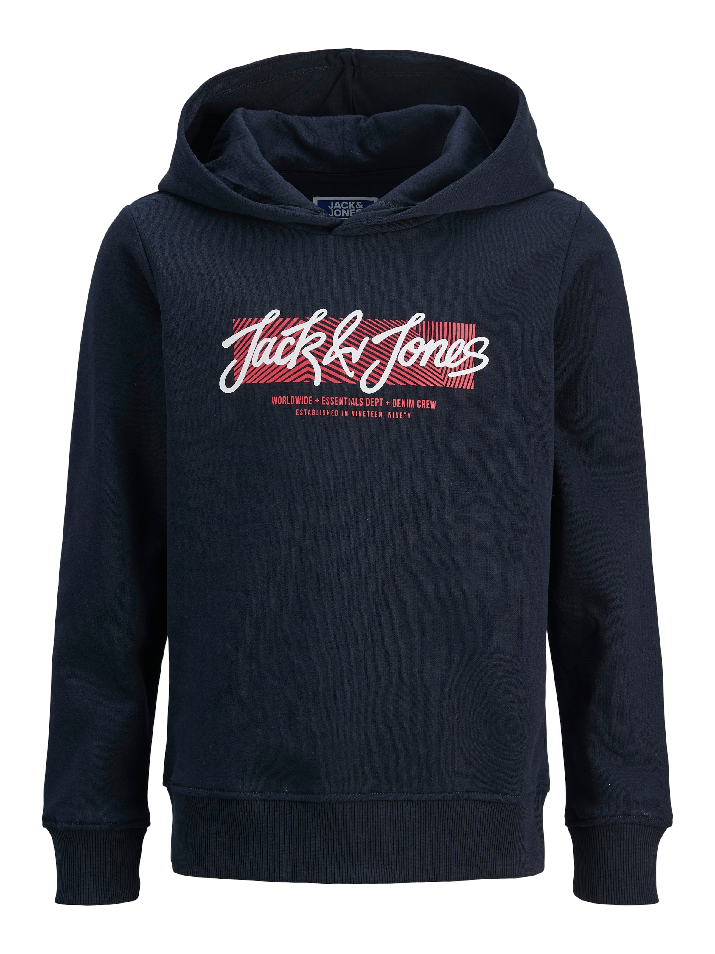 Trendiges Kapuzensweatshirt für Jungen von Jack & Jones Junior. Mit einem normalen Schnitt. Die Ärmel sind lang. Es ist mit einem lässigen Aufdruck versehen. Das Oberteil ist weich und angenehm auf der Haut dank der angerauten Innenseite aus Sweatstoff.