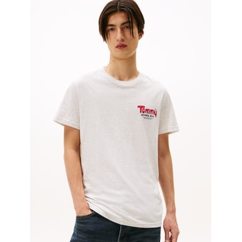 Kombistarkes Herren-T-Shirt von Tommy Jeans mit Printmotiv auf dem Rücken. Mit einem normalen Schnitt. Der Rundhals-Ausschnitt zeigt sich mit einem Rippbündchen. Das Oberteil aus dehnbarem und weichem Single Jersey sorgt für hohen Tragekomfort.