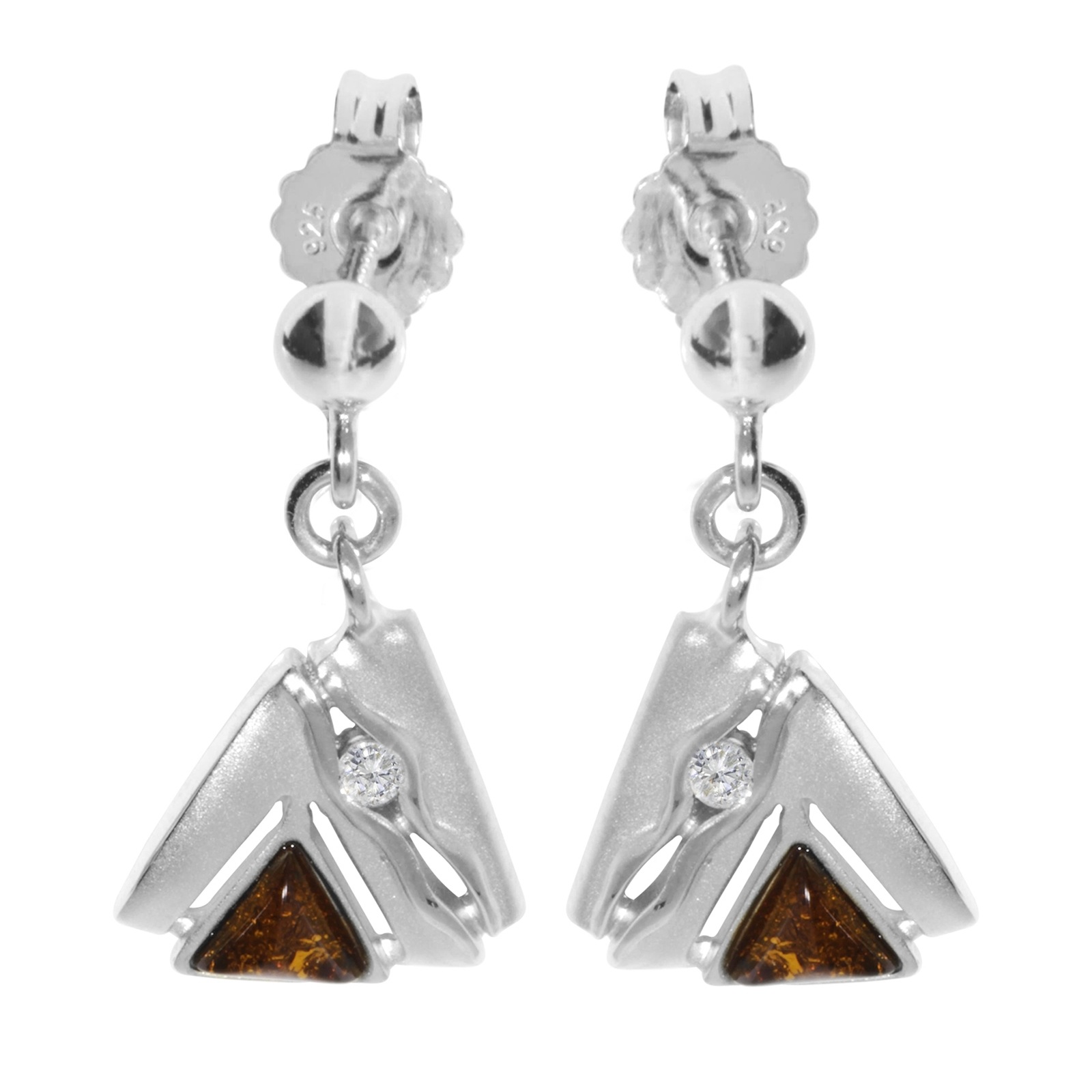 Ein moderner Ring aus Sterlingsilber 925/000 mit mattierter Oberfläche. Als Steine sind ein "cognacfarbener" Bernstein in der Größe 4,7 x 4,7 mm und ein 2,5 mm Zirkonia eingesetzt.