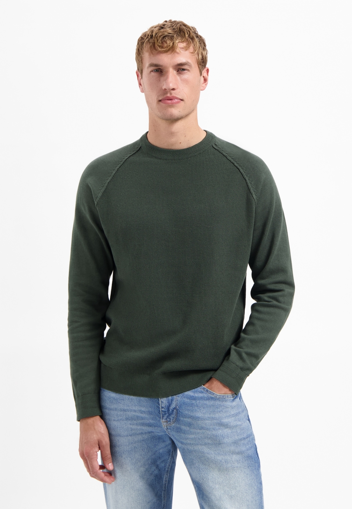 Dieser Pullover besticht durch eine moderne Waffelstruktur für einen dezent strukturierten Look. Raglanärmel und eine weiche Baumwollmischung sorgen für höchsten Komfort. Kombinieren Sie ihn mit Jeans oder Chinos für ein entspanntes Outfit.