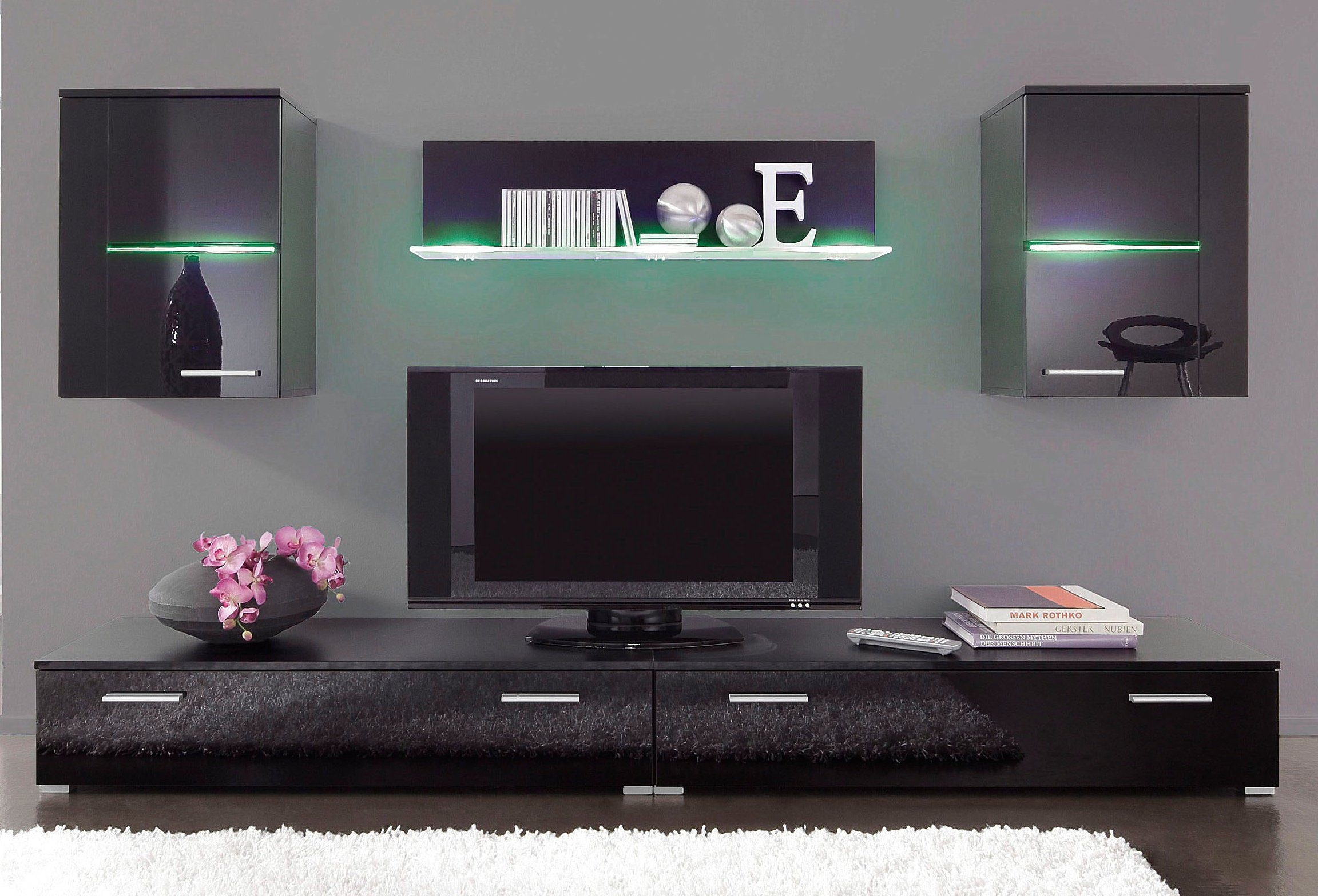 - Set besteht aus 2 Hängeschränken, 1 Wandboard und 2 TV-Unterschränken