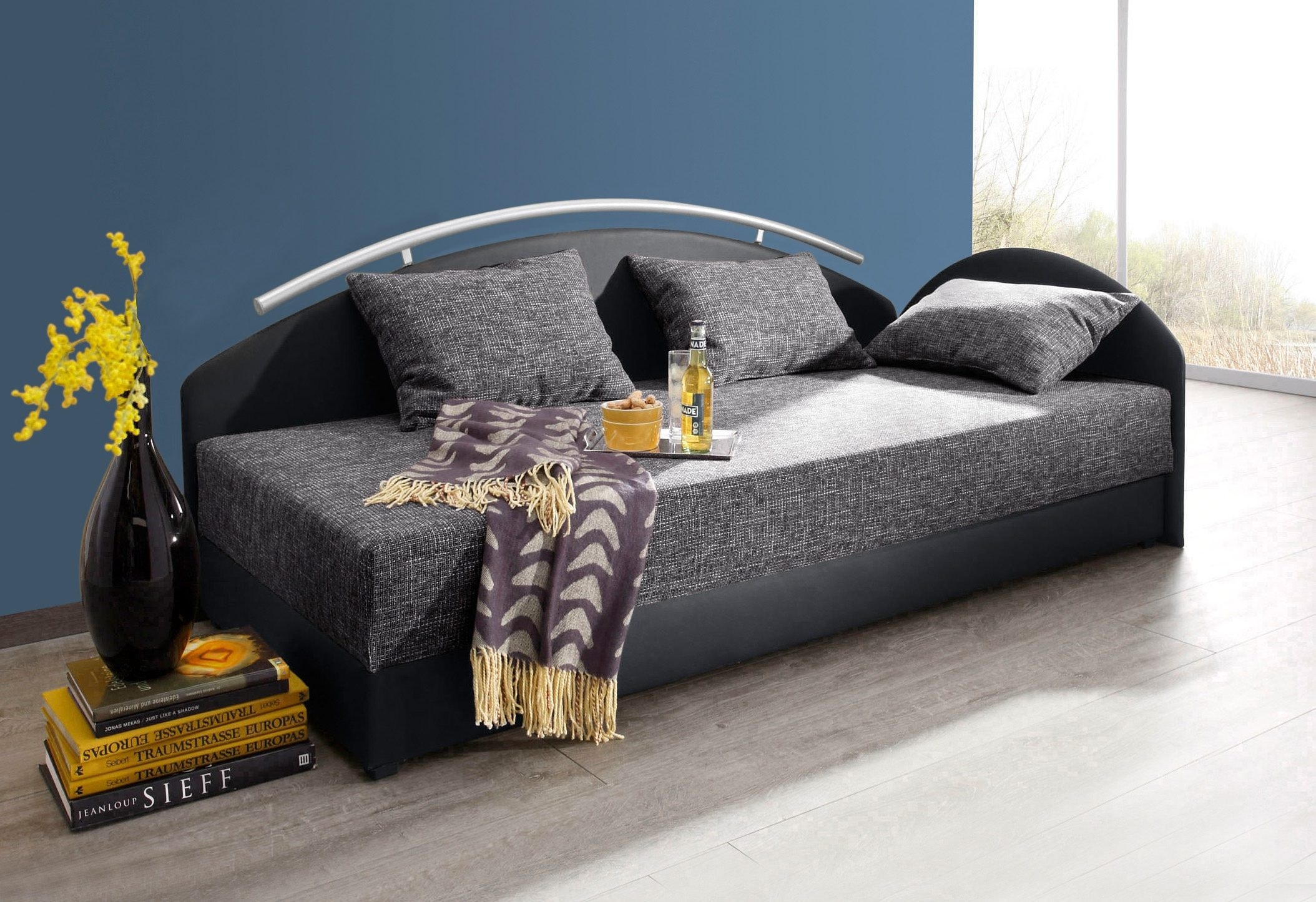 Wissenswertes | In moderner Optik. In 3 Farben und 2 Größen. Mit Seitenteil und Metall-Reling am Rücken. Das Seitenteil ist wahlweise rechts oder links montierbar. Bezug aus Kunstleder, Liegefläche mit Strukturstoff aus 70% Polyester und 30% Polyacryl. In 2 Ausführungen: