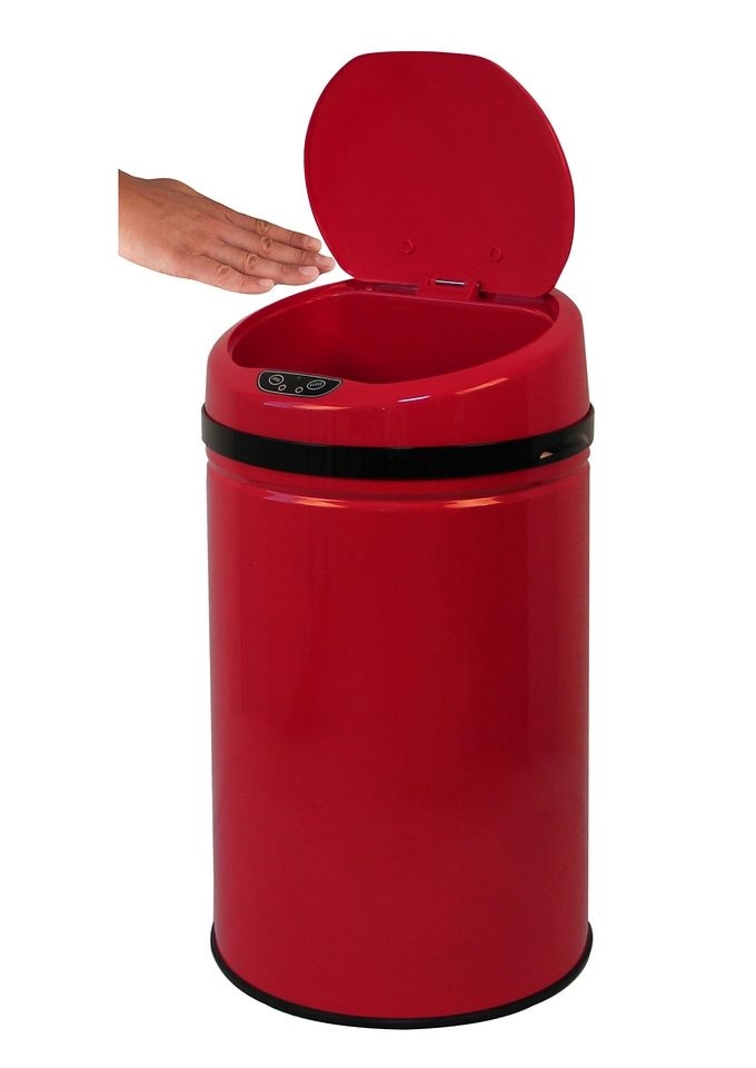 Edelstahl-Abfalleimer, ECHTWERK, »INOX RED«, mit Infrarotsensor, 30 Liter. In Rot. Der Deckel öffnet und schließt automatisch in Sensor Reichweite nach 5-6 Sekunden. Neben dem Infrarotsensor besitzt der Abfalleimer auch manuelle Bedienknöpfe zum An- und Abschalten des Sensors und zum Öffnen und Schließen. Der Korpus besteht aus Edelstahl, der Deckel aus Kunststoff. Außerdem besitzt der Edelstahl-Abfalleimer einen herausnehmbaren Inneneimer und einen Klemmring für Müllbeutel. Zudem ist der Edelstahl-Abfalleimer von Echtwerk sehr pflegeleicht und hygienisch und hat einen Bodenring zum Schutz von empfindlichen Böden. Er hat ein Fassungsvermögen von 30 Liter, einen Durchmesser von ca. 30,5 cm, eine Höhe von ca. 56,5 cm und ein Gewicht von ca. 2,8 kg. Die Sensor-Reichweite beträgt 10-15 cm und der Betrieb erfolgt durch AA Batterien LR 6, welche nicht im Lieferumfang enthalten sind. Als Müllbeutel werden 30-Liter-Beutel empfohlen.