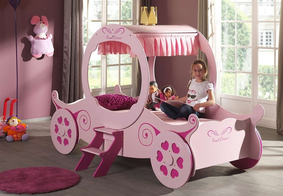 Wissenswertes  | Dieses schöne Kutschenbett ist der Traum in jedem Kinderzimmer. Aus hochwertigem FSC®-zertifiziertem MDF gefertigt, die Oberflächen sind rosa lackiert und pinkfarben abgesetzt. Das Bett ist mit viel Liebe zum Detail gestaltet worden. Die kleine Treppe ermöglicht einen leichten Ein- und Ausstieg. Der Aufbau bietet rechts und links ein großes Fenster zum hindurch schlüpfen. Die goldfarbene Krone und der pinkfarben Vorhang am Kutschendach, sowie die Räder mit herzförmigen Ausschnitten, pink hinterlegt, setzen optische Akzente. An den Bettseiten, wie auch am Kopf- und Fußteil befindet sich ein dekorativer Aufdruck in pink. Das Bett ist ein idealer Ort zum Träumen und Kuscheln. Weitere Produktinformationen: