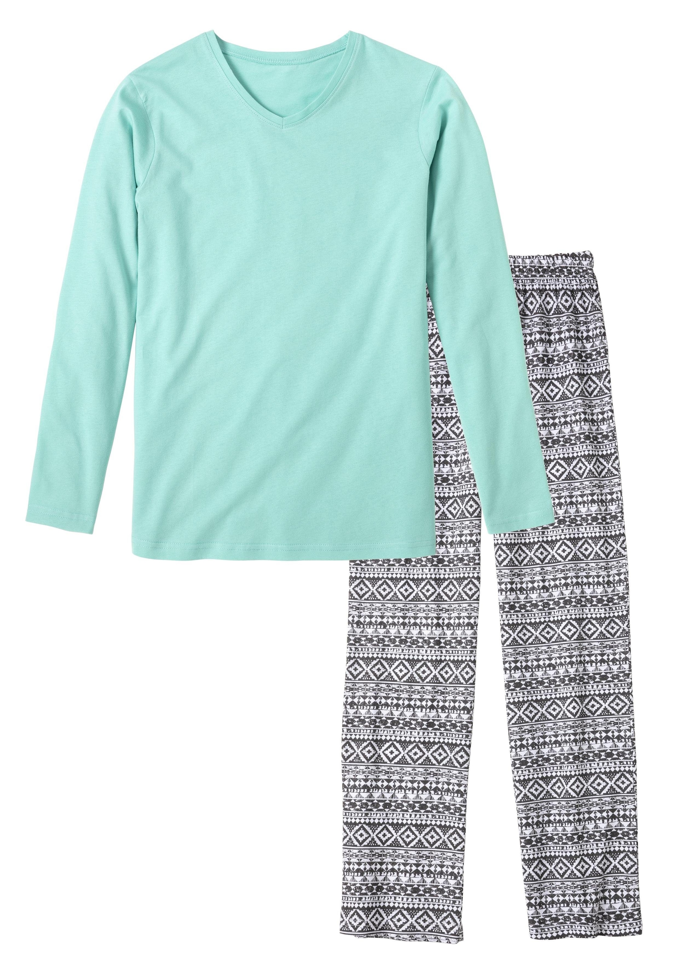 Buffalo Pyjama in langer Form. Bedruckte Pyjamahose, Oberteil unifarben mit V-Ausschnitt. Oberteil und Unterteil aus weicher Qualität.
