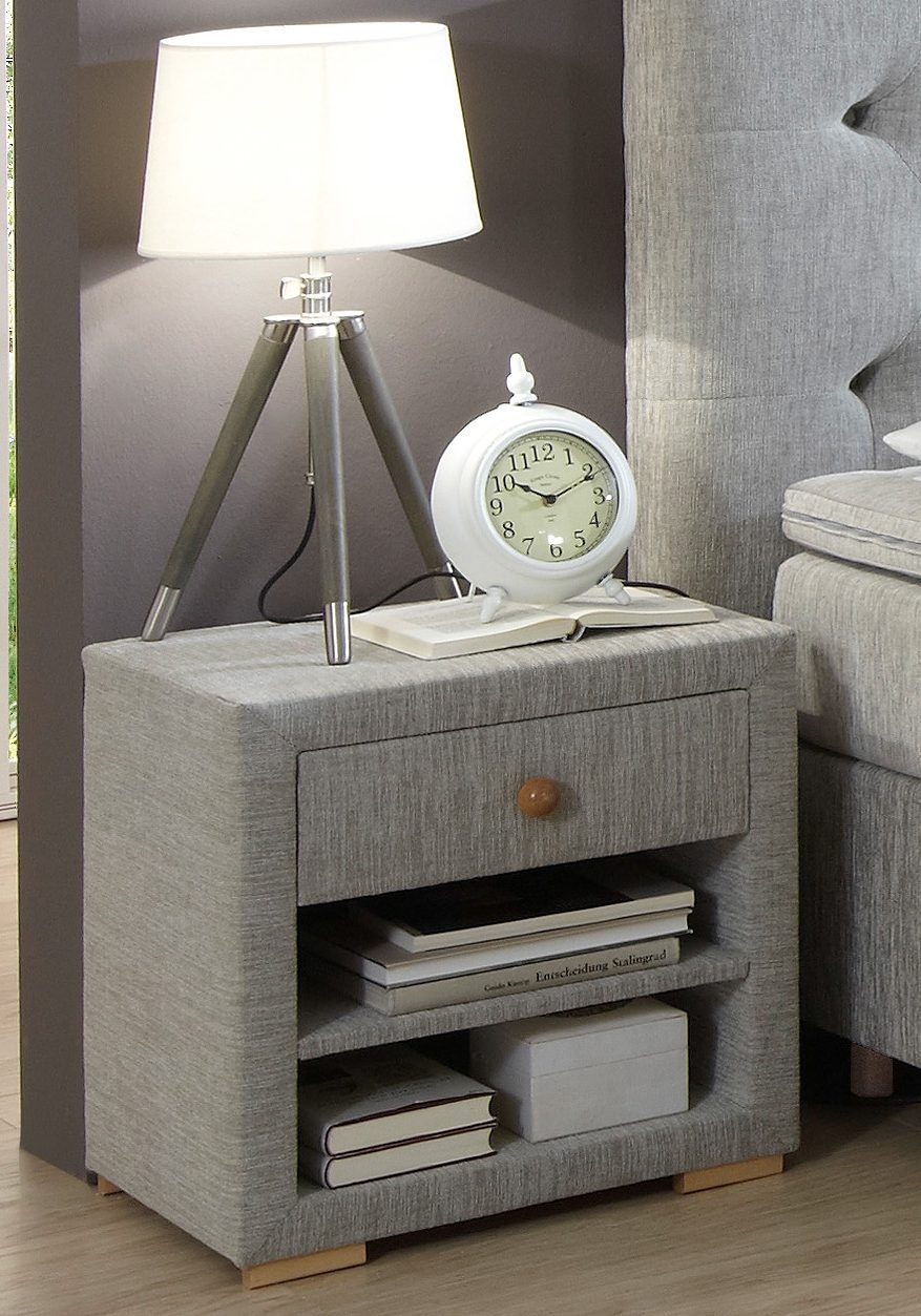 Wissenswertes | Nachttisch Landhausstil. Mit einem Schubkasten auf Metalllaufleisten. Darunter befinden sich 2 offene Fächer. Hellgrauer Strukturstoffbezug aus 100% Polyacryl. Mit Holzfüßen und Griff in Naturfarben. In folgenden Farben erhältlich: