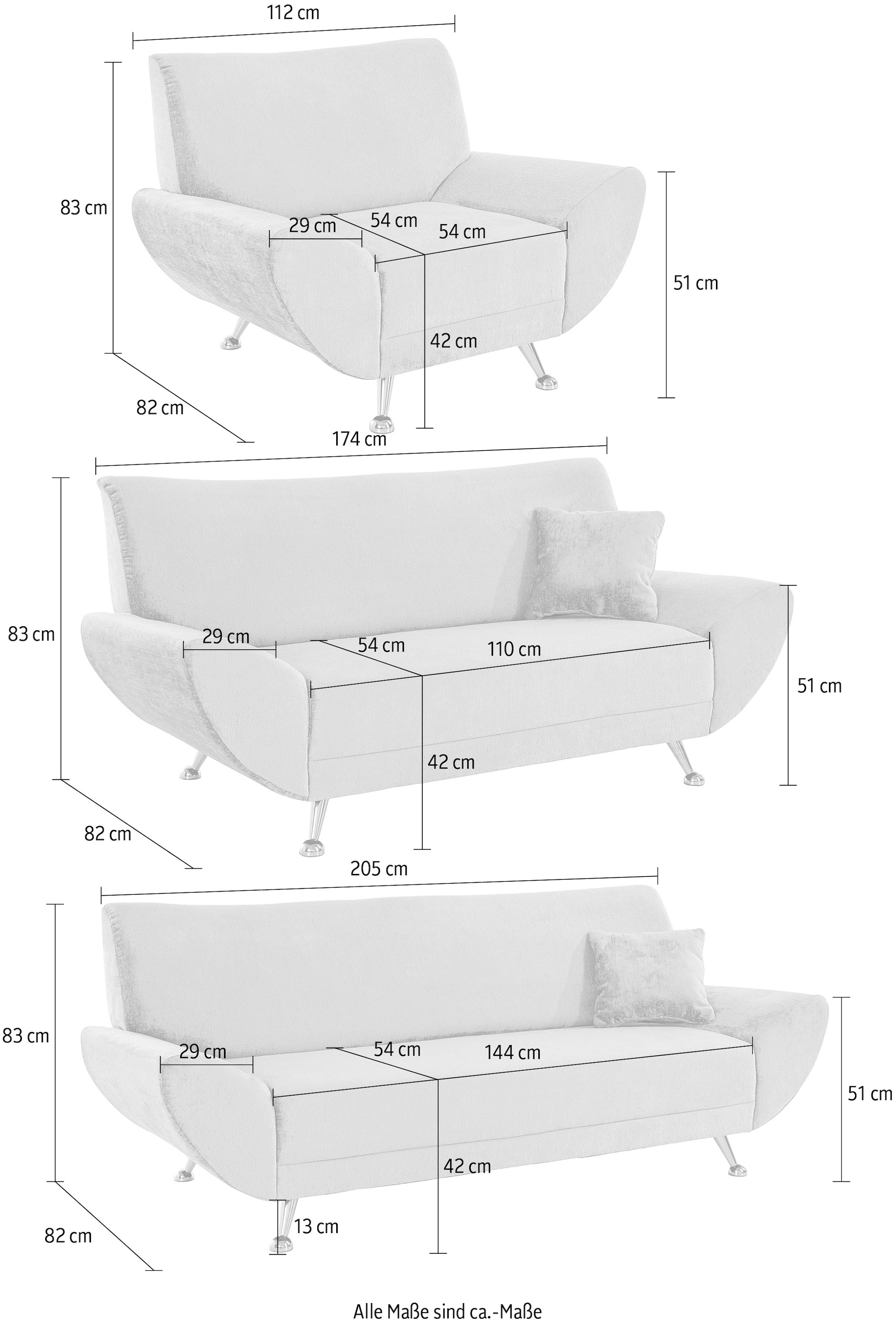 Bequem und einladend: Die 3-teilige Polstergarnitur von INOSIGN bietet hohen Sitzkomfort. Dafür sorgen neben dem stabilen Gestell aus FSC®-zertifiziertem Holzwerkstoff auch die angenehme Wellenunterfederung und die atmungsaktive Polyätherschaum-Polsterung. Die Garnitur setzt sich aus einem 2-Sitzer, einem 3-Sitzer sowie einem breiten Sessel zusammen. Das moderne Design punktet mit elegant geschwungener Linienführung. Hübsch abgerundete und spitz zulaufende Arm- und Rückenlehnen sowie schräge, rund abschließende Metallfüße kennzeichnen die besondere Formensprache. Die hochwertigen Polstermöbel sind auch auf der Rückseite mit dem Originalstoff bezogen und lassen sich daher je nach Geschmack und räumlichen Gegebenheiten frei im Wohnbereich positionieren. Sie sind in mehreren angesagten Farben und in diversen Bezugsqualitäten sowie einschließlich loser, passend gestalteter Zierkissen erhältlich.