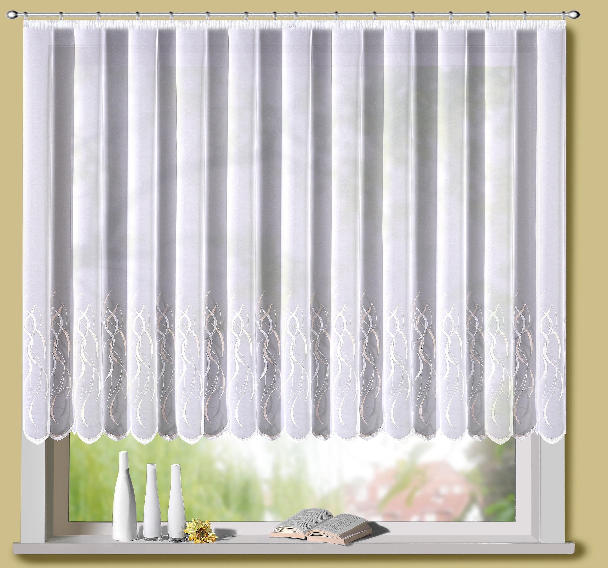 Blumenfenster und Langstores aus dem Hause Stickereien und Textilien Plauen mit echter Plauener Stickerei. Filigrane Stickerei. Material 100 % Polyester, sehr pflegeleicht. Oben mit Universalschienenband, einfache Montage
