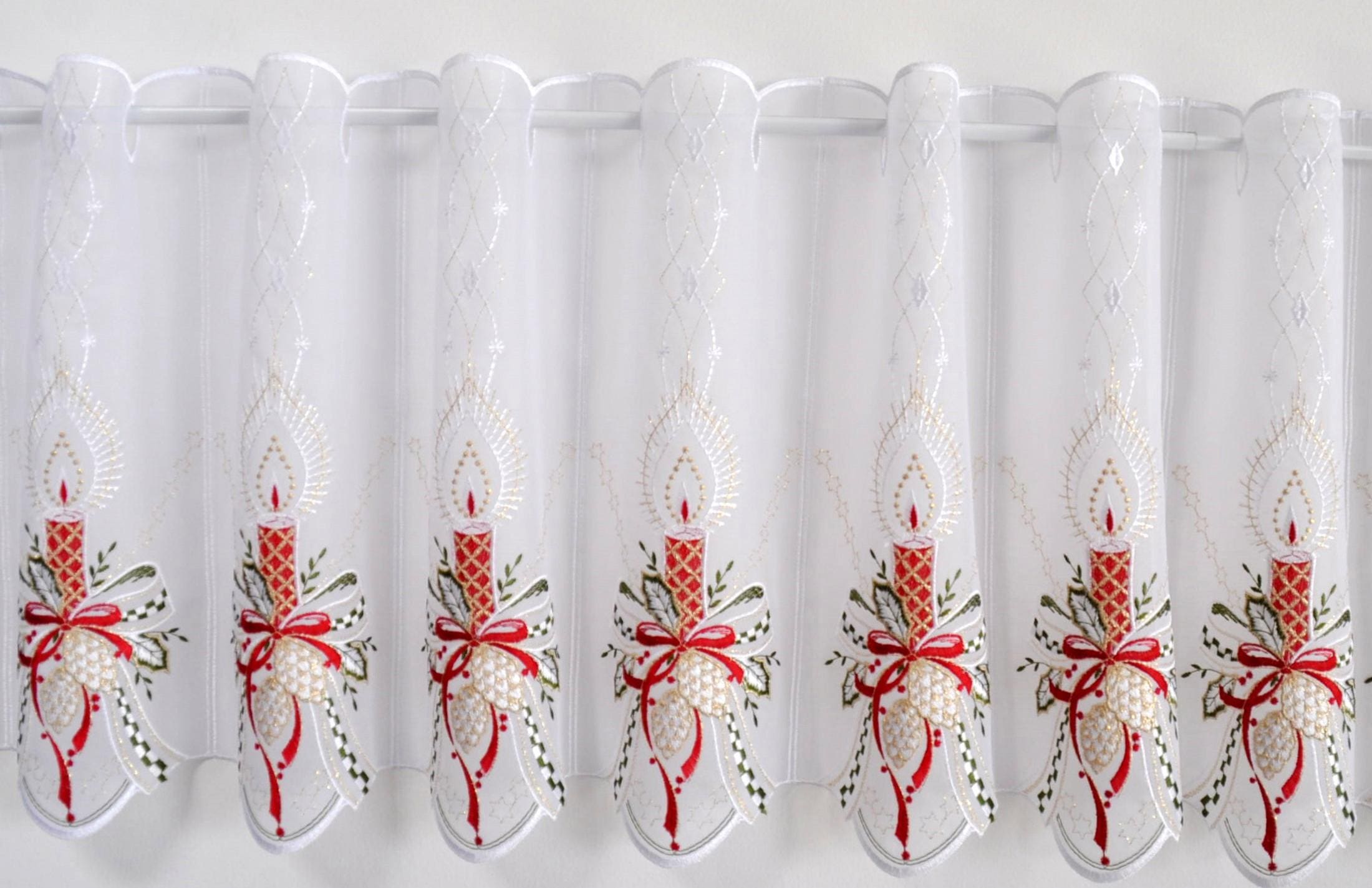 Für eine sinnliche Weihnachtszeit sorgt die reichaltig bestickte Scheibengardine »Kerzenschein« aus dem Hause Stickereien und Textilien Plauen. Echte Plauener Stickerei gesickt auf einem Transparentem Voile sorgt für ein wunderschönes Wohnambiente. Das pflegeleichte Material ist in der Maschine waschbar. Mit dem leichten Glanz des Polyestergarnes wird ein stilvolles Ambiente an Ihrem Fenster geschaffen.