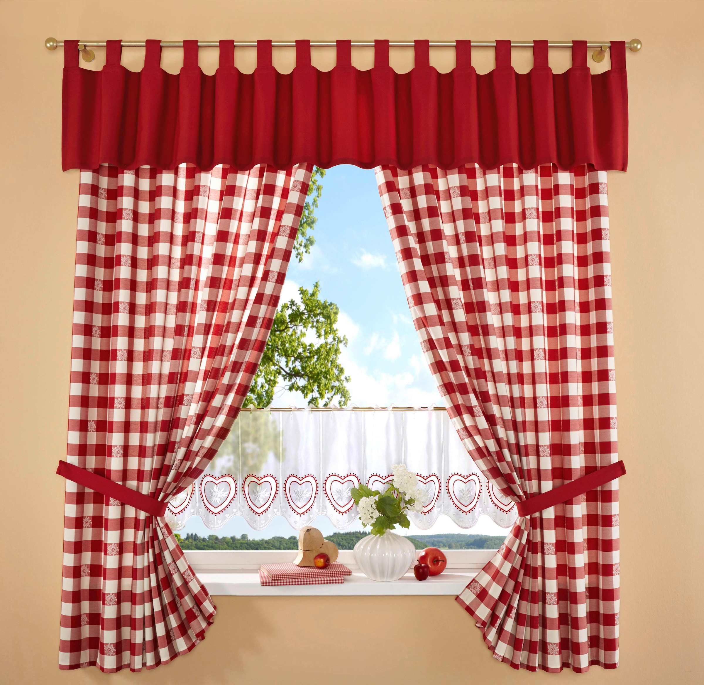 Hinweis Dekoration | Die angegebenen Maße sind Stoffmaße.;Am Fenster fertig dekoriert, reduziert sich die Breite um ca. die Hälfte. |