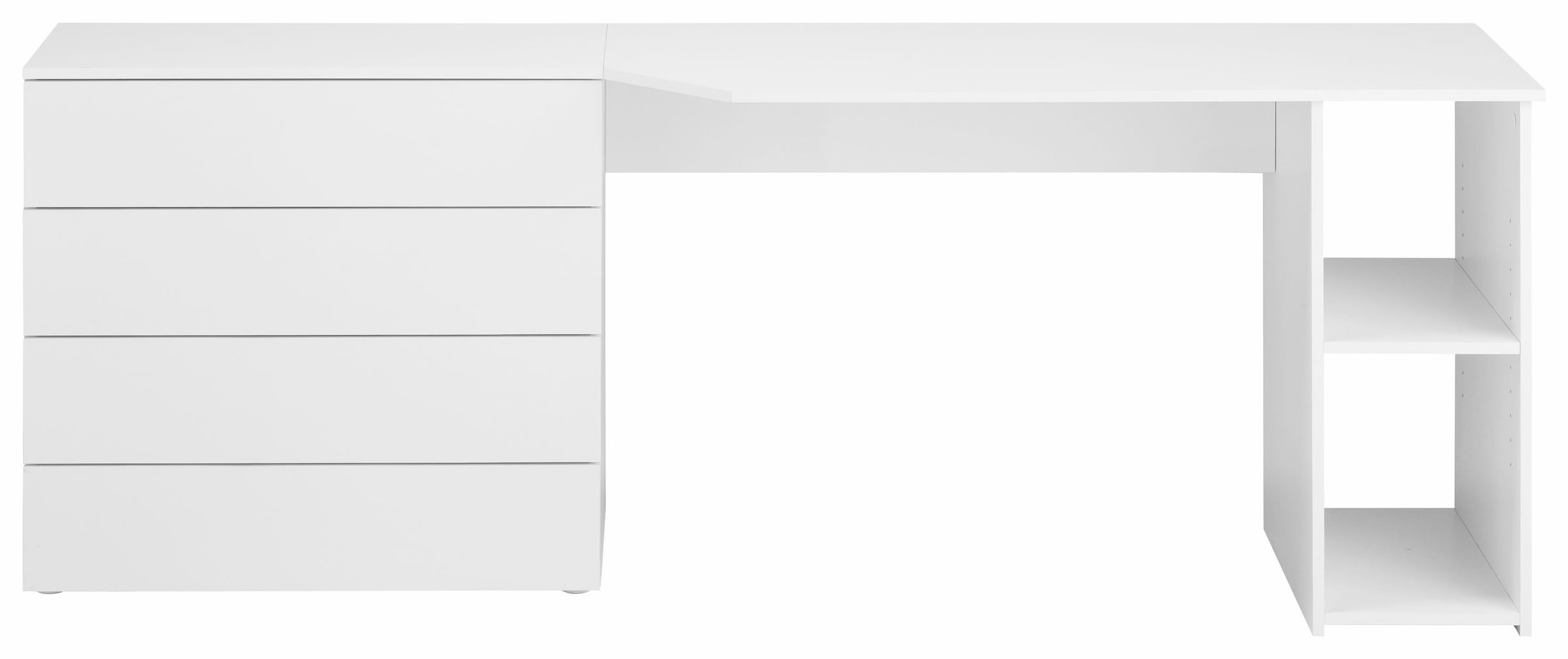 Außergewöhnliche Schreibtischkombination aus dem Programm »Vaasa«. Dieser besondere Artikel überzeugt durch ansprechendem Design aus einer Kombination aus Schreibtisch und Schubkastenkommode. Auf der linken Seite befindet sich die Kommode mit viel Stauraum für Ihre persönlichen Dinge. Dies bieten die vier Schubkästen, die auf Metallkugelführungen geführt sind. An diese Kommode wird der Schreibtisch angebaut. Den PC-Tower können Sie ganz bequem im rechten Fach verstauen. Der Boden rechts ist höhenverstellbar, entsprechend haben Sie hier die Möglichkeit, individuell zur Towergröße, das Fach zu verkleinern oder aber auch zu vergrößern.