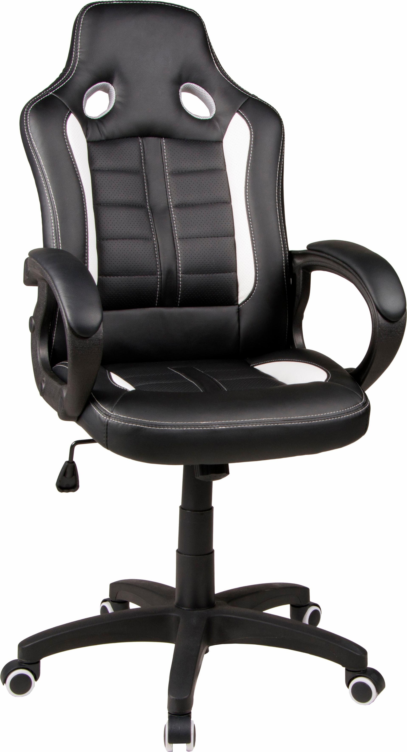 Wissenswertes | Gaming Chair »Fabio«. Hochwertiges Kunstleder, kombiniert mit modernem Netzstoffbezug. Stufenlose Sitzhöhenverstellung durch Sicherheitsgasdruckfeder. Wippmechanik mit Härtegradeinstellung zur Einstellung des Wippverhaltens. Farblich abgesetzte Ziernähte für die gehobene Optik. Gebremste Sicherheitsdoppelrollen weiß, nutzbar für feste Bodenbeläge. Armlehnen für die angenehme Sitzposition, schwarz. Fußkreuz aus besonders belastbarem Nylon, schwarz. Bis zu 6 h sitzen am Tag. Belastbarkeit bis zu 100 kg. Einsetzbar in jedem Heimbüro. (Keine gewerbliche Nutzung). In folgenden Farben erhältlich:
