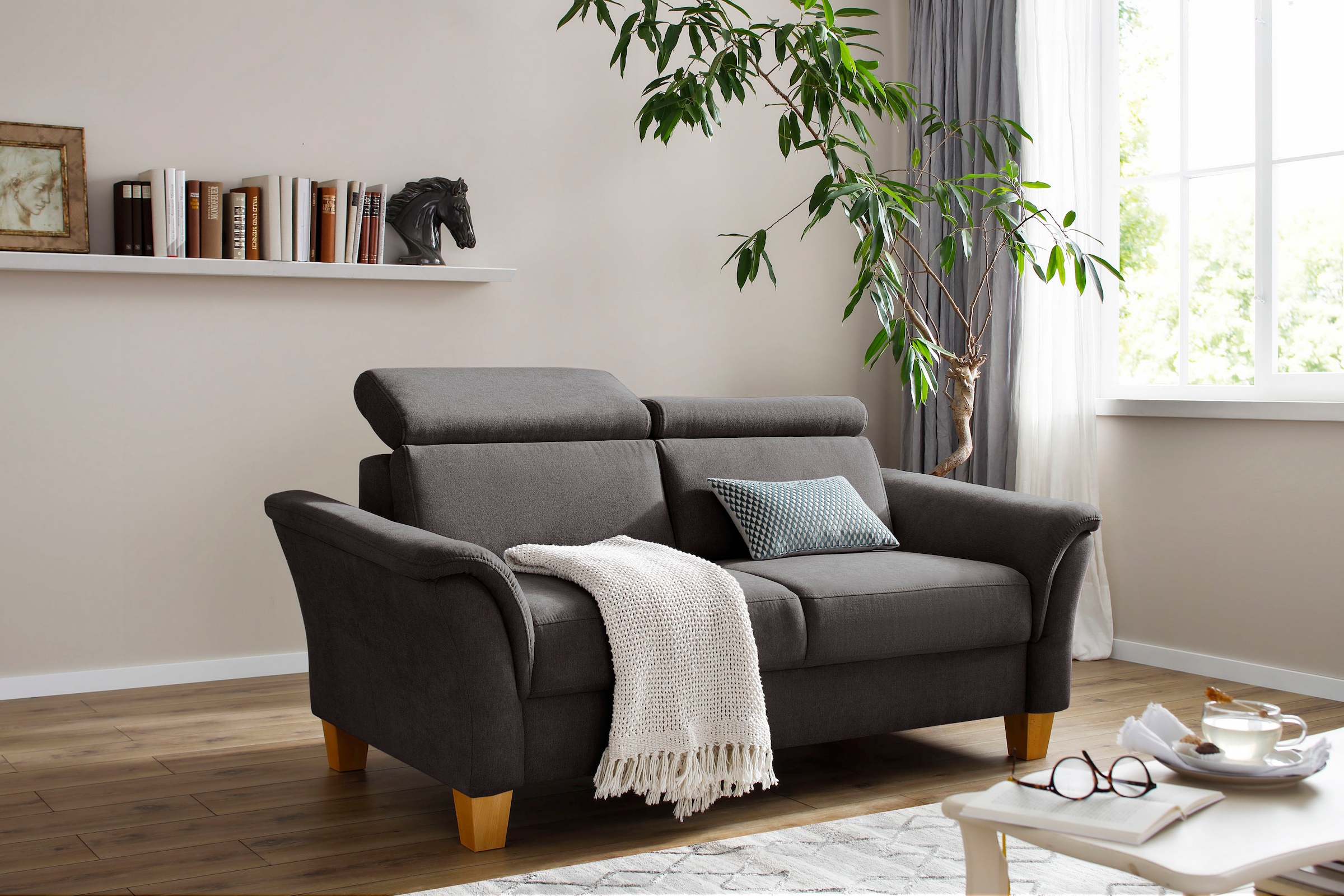 Im modernen Look ergänzt der bequeme 2,5-Sitzer »Earl« von Home affaire die Wohnzimmereinrichtung. Das Sofa ist in mehreren Bezugsqualitäten erhältlich. Rein optisch zeichnet es sich durch einen trendigen Charme aus und wird durch schöne Holzfüße ergänzt. Für Komfort sorgt neben dem stabilen Gestell aus FSC®-zertifiziertem Holzwerkstoff vor allen Dingen die komfortable Wellenunterfederung im Zusammenspiel mit der atmungsaktiven Polyätherschaum-Polsterung. Auf Wunsch kann eine passende Kopfstütze separat bestellt werden, die den Wohlfühlfaktor zusätzlich erhöht. Mehr Gemütlichkeit bringt der bequeme 2,5-Sitzer »Earl« von Home affaire in das heimische Wohnzimmer.