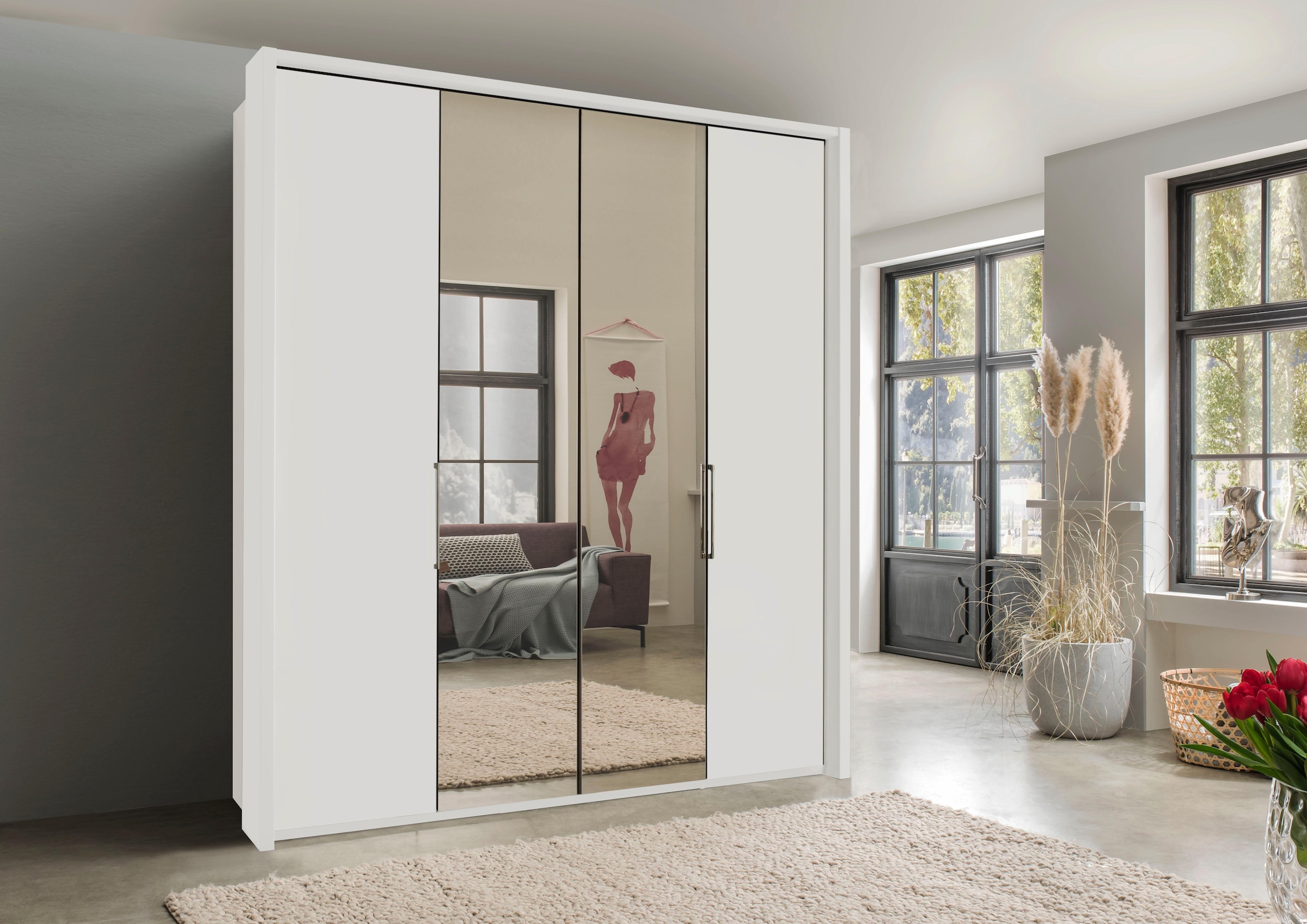 Wissenswertes | Edler Kleiderschrank in der Mitte mit selbstöffnenden Falttüren. Durch leichtes Ziehen an den Türgriffen wird eine Gasdruckfeder aktiviert, die die Falttüren automatisch öffnet. In 3 Breiten. Fronten: außen mit Dekor, Falttüren mit Spiegelelementen. Pflegeleichte Kunststoffoberfläche. Metallgriffe, chromfarben. Maße (T/H): 58/217 cm. Details: