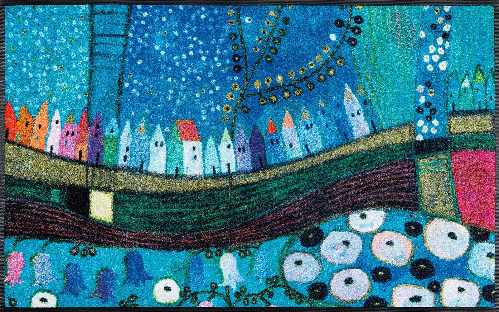Bodenkunst für Zuhause. Die waschbare Fußmatte „Stadt in Blau“ von wash+dry by Kleen-Tex macht sich mit der Malkunst von Eugen Stross zum Blickfang in einem jeden Zuhause. Die wunderschöne Bildkomposition glänzt durch eine stimmungsvolle und kräftige Farbpalette und bringt ein malerisches Kunstwerk auf Ihren Boden. Doch nicht nur optisch sind Matten der Marke wash+dry by Kleen-Tex eine ausgezeichnete Wahl. Neben dem dekorativen Aspekt kommt bei allen wash+dry Matten und Läufern die Funktion nicht zu kurz. Zuverlässig nimmt der flache, dichte Flor aus Polyamid Schmutz und Feuchtigkeit auch in hoch frequentierten Bereichen auf. Die rutschhemmende Rückenbeschichtung aus Nitrilgummi sorgt für sicheren Stand. Aufgrund von Farbechtheit und Formstabilität kann die Matte einfach in der Waschmaschine und auch im Trockner gereinigt werden, um die jahrelange Freude an der Matte zu gewährleisten. Der Teppich ist 100% PVC-frei.