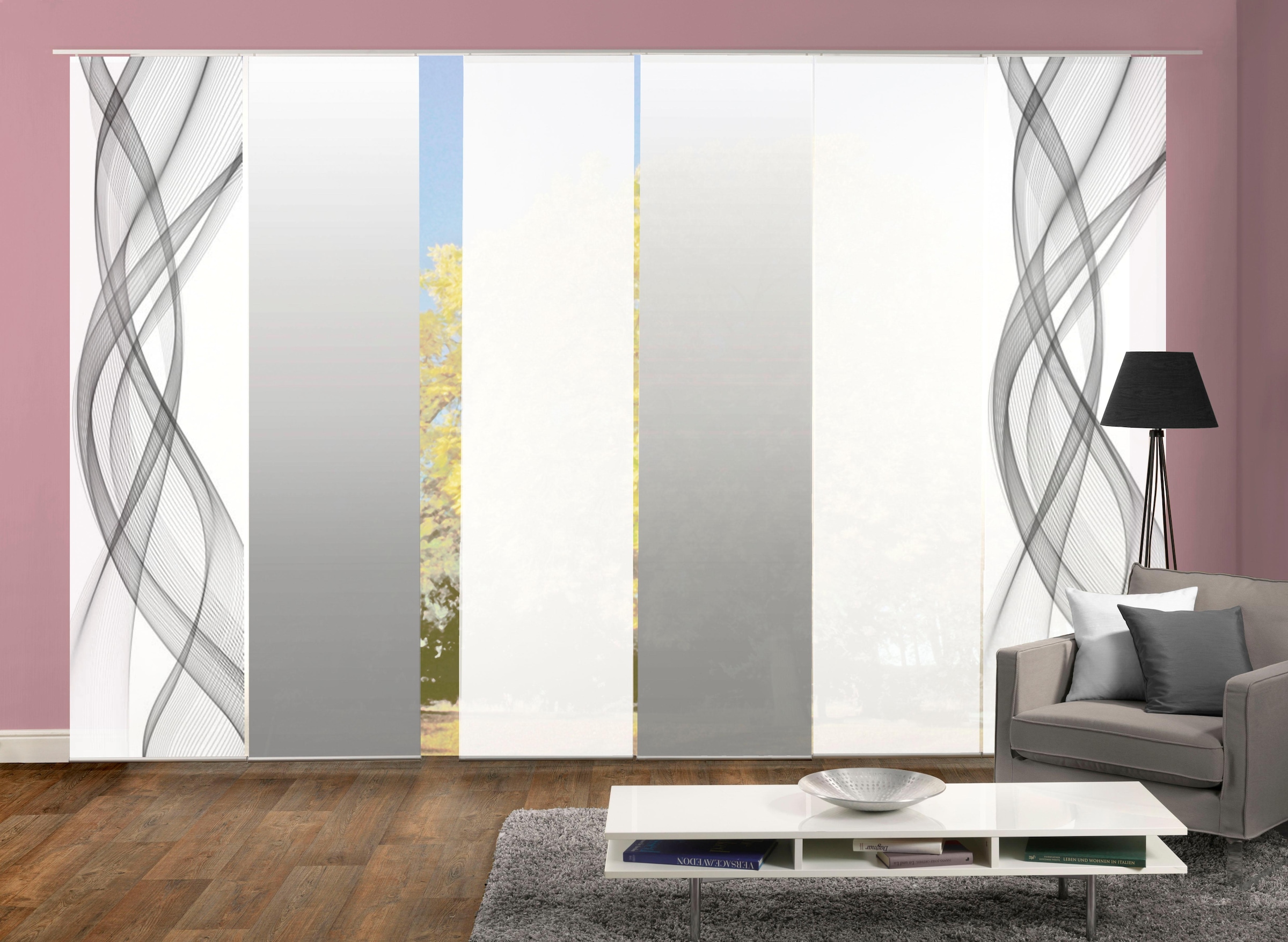 Schöne moderne SchiebevorhangSets der Marke HOME WOHNIDEEN. Die Schiebevorhänge bestehen aus 100% Polyester. Sie werden inkl. Paneelwagen und Klemmleiste geliefert. Sets können bestehen aus 3, 4, 5 oder 6 Schiebevorhängen, digitalbedruckte aber auch Unifarbene, blickdicht wie auch halbtransparent.