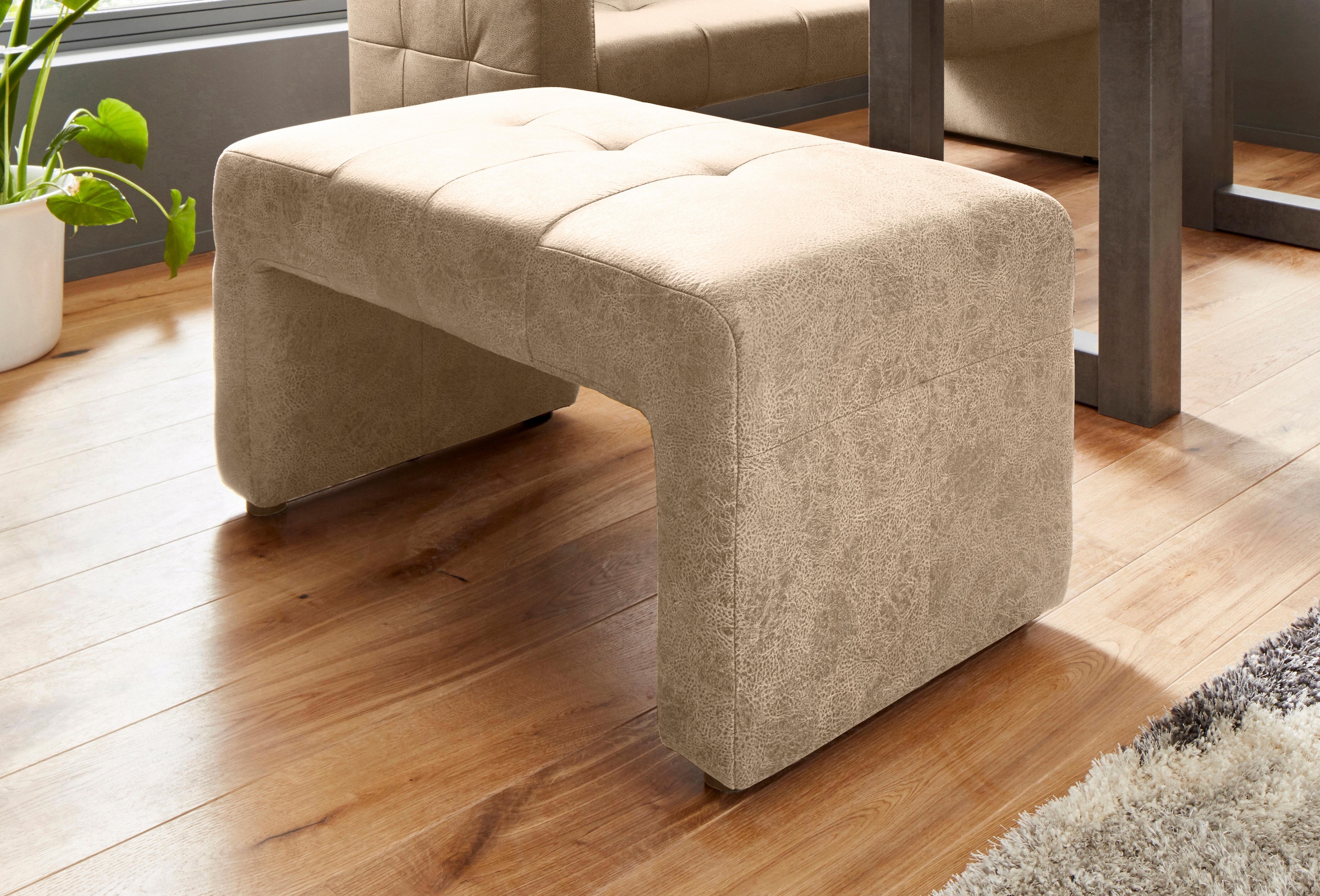 Ein toller Blickfang ist der hochwertige Hocker »exxpo - sofa fashion«. Das wunderschöne Möbelstück kann direkt auf den ersten Blick voll und ganz überzeugen: Das stabile Gestell ist aus FSC®-zertifiziertem Holzwerkstoff gefertigt - es ist sehr stabil und steht außerdem für den Umgang mit der Ressource Holz. Dank des Gestells erhält die kleine Bank eine bodenfreie Optik, wirkt besonders luftig und modern. Unterstützt wird dieses Erscheinungsbild durch den ansprechenden Bezug aus strapazierfähigem und ebenso pflegeleichtem Microfaser im Leder-Look. Das Sitzmöbel hat außerdem eine bequeme Polsterung, die auch langes Sitzen zum absoluten Vergnügen macht.