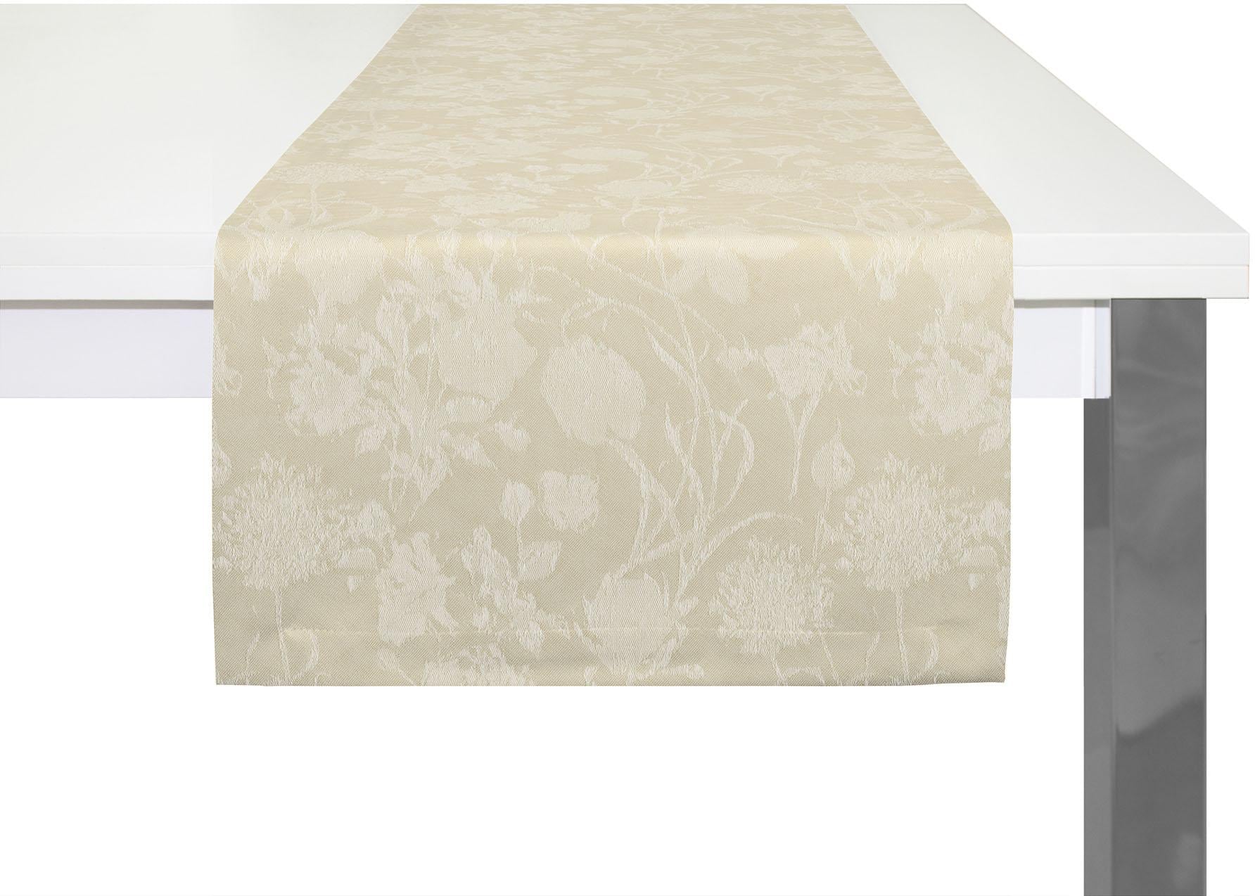 Tischläufer "Flower Cuvée" aus 100% GOTS-Bio-Baumwolle. Florales Jacquard-Design und pflegeleicht - für elegante Tischdekoration.