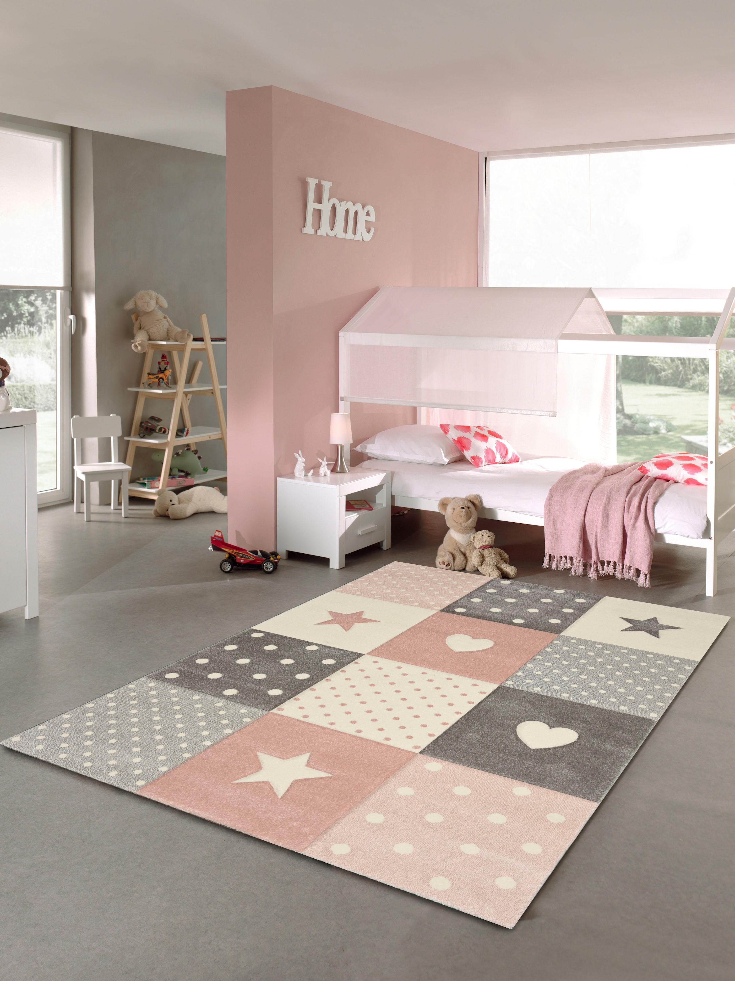 Musterteppiche bringen Stimmung in den Raum und schaffen ein harmonisches Klima. Die Kombination von Herz und Stern mit den gepunkteten Flächen geben diesem Teppich eine trendige und ausgeglichene Optik. Durch den präzisen Konturenschnitt wirken die Quadrate effektvoll und plastisch. Der Teppich ist Schadstoff geprüft und Fußbodenheizung geeignet. Der Highlighter für ihr Kinderzimmer aus dem Hause merinos!
