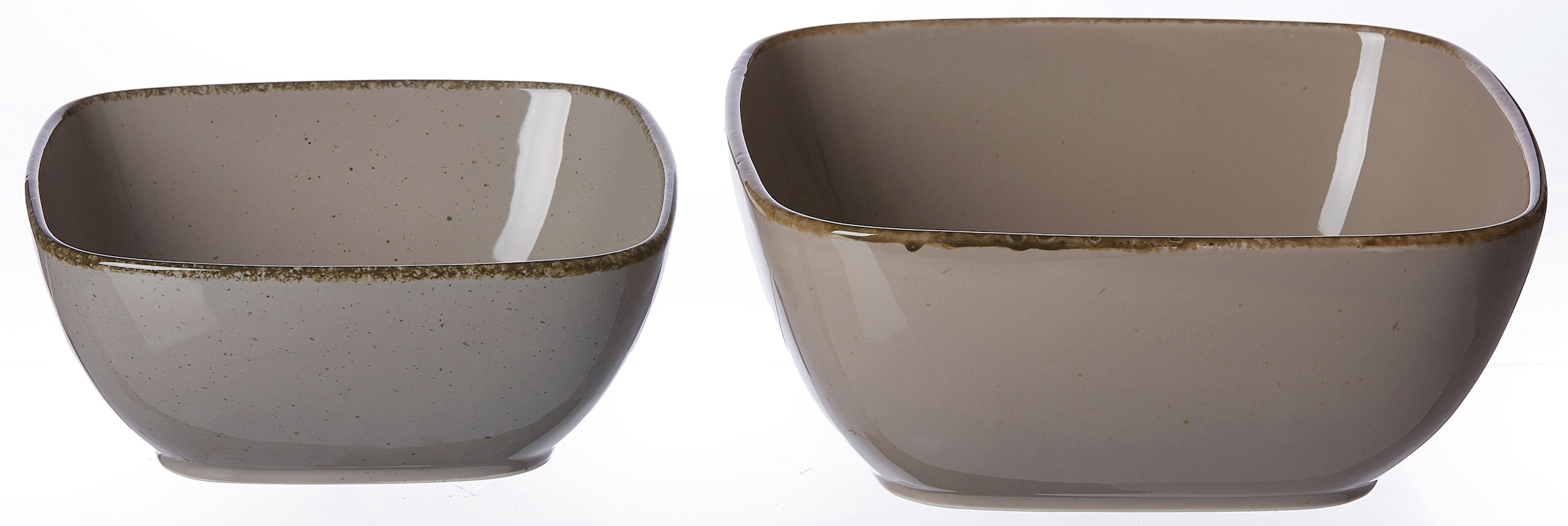 Ritzenhoff & Breker Schalen-Set »Casa« aus hochwertigem Porzellan. Die Geschirrserie »Casa« bietet endlose Möglichkeiten beim Mix & Match. Die diversen Formen und verschiedenen Größen lassen sich immer wieder und originell zusammenstellen. Die drei natürlich-dezenten Erd- & Aqua-Töne lassen sich ganz nach Lust und Laune zu attraktiven Farbspielen kombinieren. Der charmante Vintage-Look mit Unikat-Charakter: schmale, braune Farbkanten mit Used-Effekt und feine braune, zufällig verstreute Farbsprenkel, die bewirken, dass kein Geschirrteil dem anderen gleicht. Das Set besteht aus: 1 Schale eckig, 18 x 18 x 8 cm. 1 Schale eckig, 22 x 22 x 9 cm.
