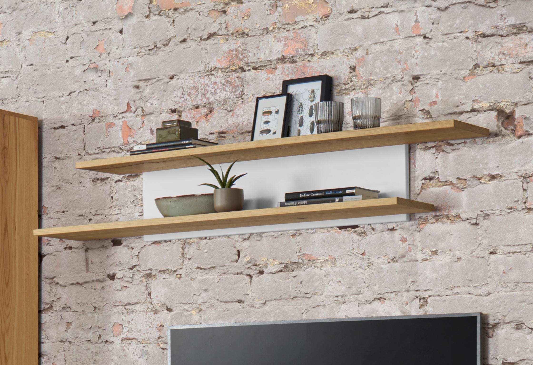 Wissenswertes | Wandboard mit einer Rückwand in MDF weiß matt und zwei Ablagen Altholzeiche furniert. In folgenden Farben erhältlich: